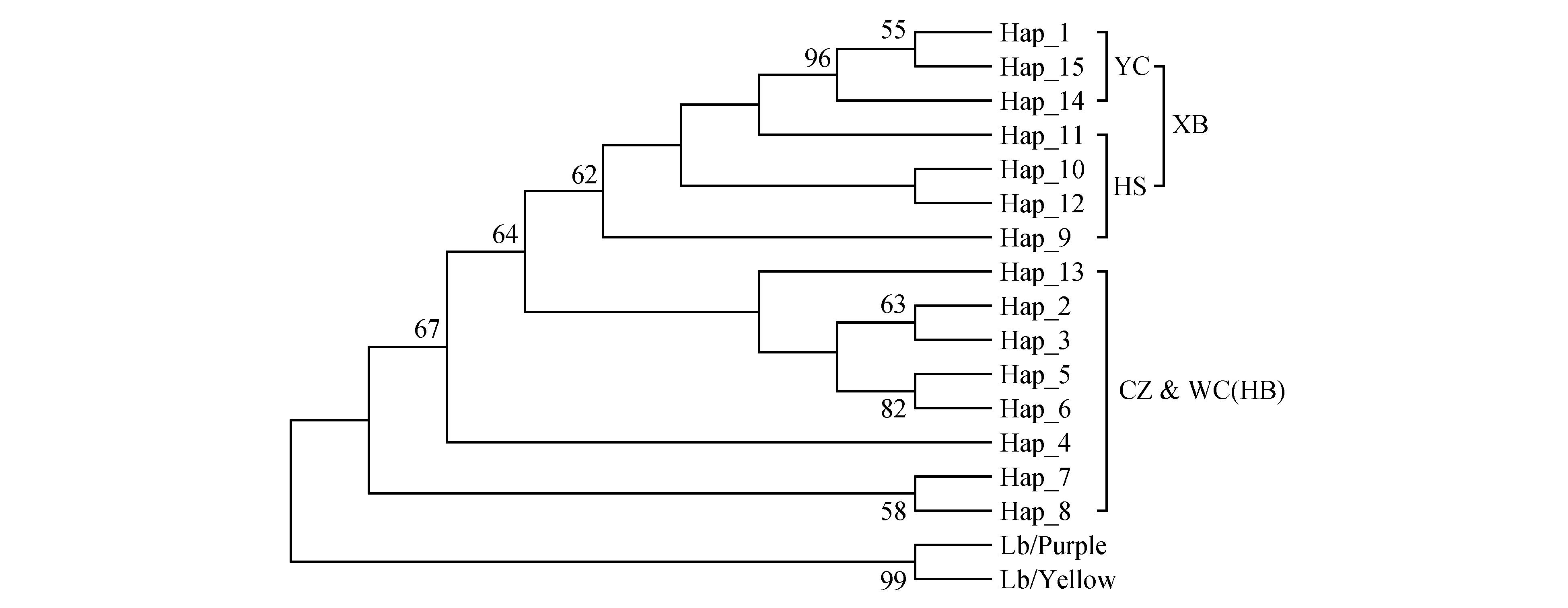 居群 Population | 单倍型数 Number of haplotype (n) | 单倍型(个体数量) Haplotypes and number of individuals | 单倍型多样性 Haplotype diversity | 核苷酸多样性 Nucleotide diversity | 核苷酸平均差异 Average number of nucleotide differences | 中性检验 Neutrality test | |