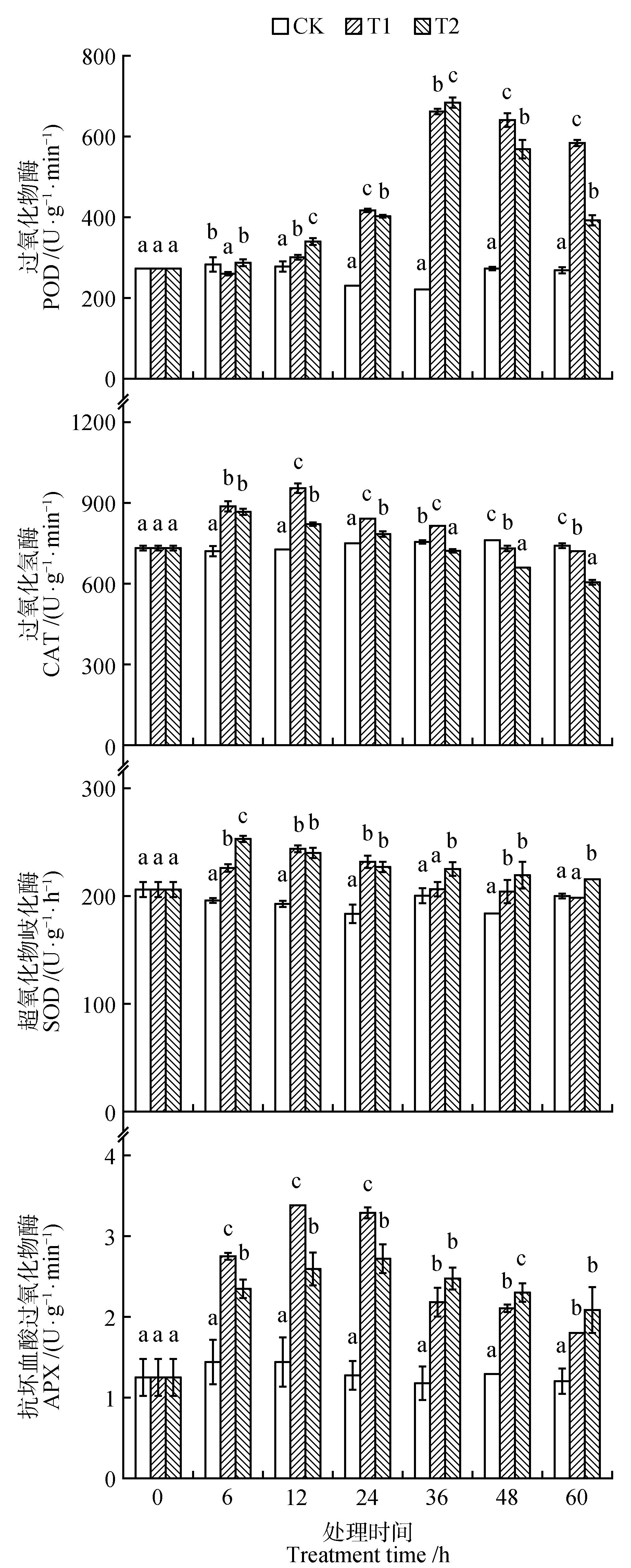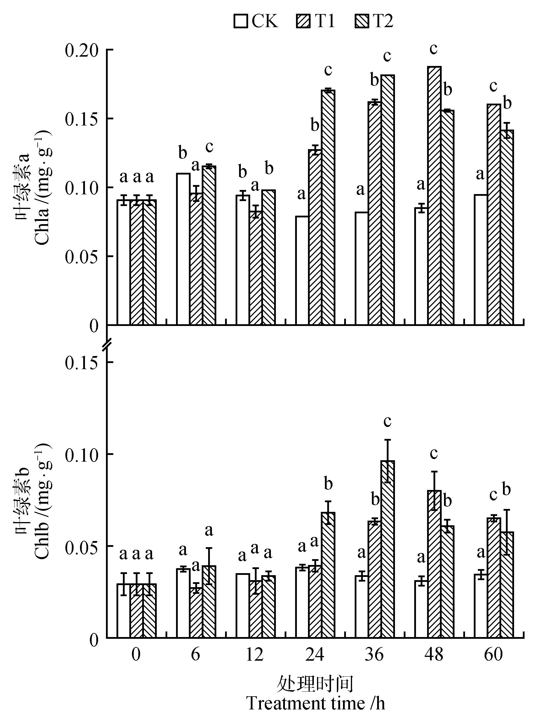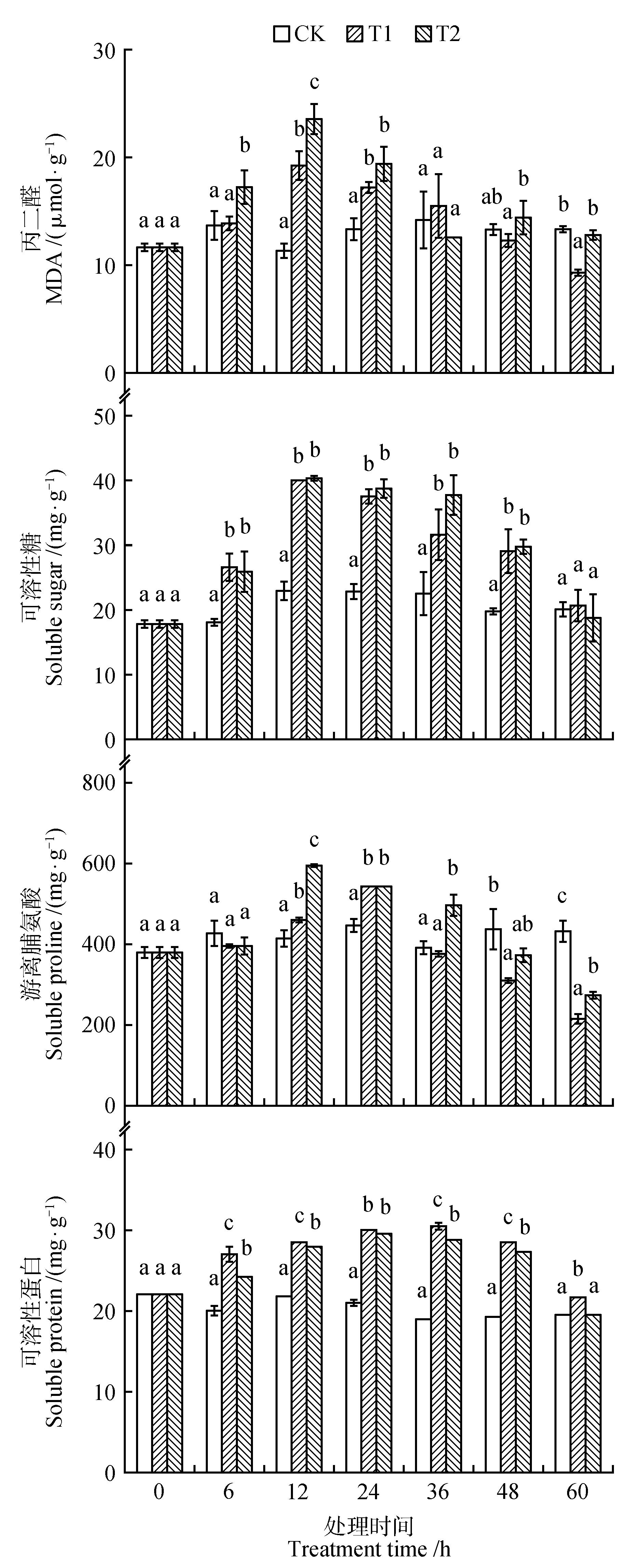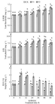 为了解药用植物菥蓂(Thlaspi arvense)在紫外线(UV-B)辐射增强下生长及响应规律,以2月龄菥蓂幼苗为研究对象,在自然光照基础上人工增补3.26 μW·cm-2(T1)和9.78 μW·cm-2(T2)2种不同辐射强度处理,以自然光照下生长的菥蓂幼苗为对照,研究菥蓂幼苗中光合指标和叶绿素荧光参数、光合色素(叶绿素a和b)含量、渗透调节物质(丙二醛、可溶性蛋白、可溶性糖和脯氨酸)含量、抗氧化酶(超氧化物歧化酶、过氧化物酶、过氧化氢酶和抗坏血酸过氧化氢酶)活性和总黄酮、总酚和黑芥子苷等次生代谢产物含量对不同UV-B辐射强度的响应。结果表明:2种辐射强度下净光合速率、气孔导度、蒸腾速率、胞间二氧化碳摩尔分数、最大荧光(Fm)、PSⅡ最大光化学效率(Fv /Fm)和PSⅡ潜在光化学效率(Fv /Fo)均随辐射强度增大而降低;叶绿素a和叶绿素b、可溶性蛋白、可溶性糖和脯氨酸等渗透调节物质、超氧化物歧化酶、过氧化物酶、过氧化氢酶和抗坏血酸过氧化氢酶活性、总酚和黑芥子苷等次生代谢产物含量均随辐射时间增加呈现先增加后降低的趋势,而总黄酮含量则呈逐渐增加的趋势,在辐射未期与对照差异显著(P<0.05)。根据研究结果综合分析,在不同辐射强度下,菥蓂通过提高总黄酮和总酚含量的合成、可溶性蛋白和可溶性糖的积累,以及叶绿素含量、超氧化物岐化酶、过氧化物酶和抗坏血酸过氧化氢酶活性的增加,抵抗紫外胁迫对其造成的影响,进而菥蓂表现一定的抗性和对逆境环境的适应性,这为菥蓂抗逆性培育和进一步利用提供理论基础。