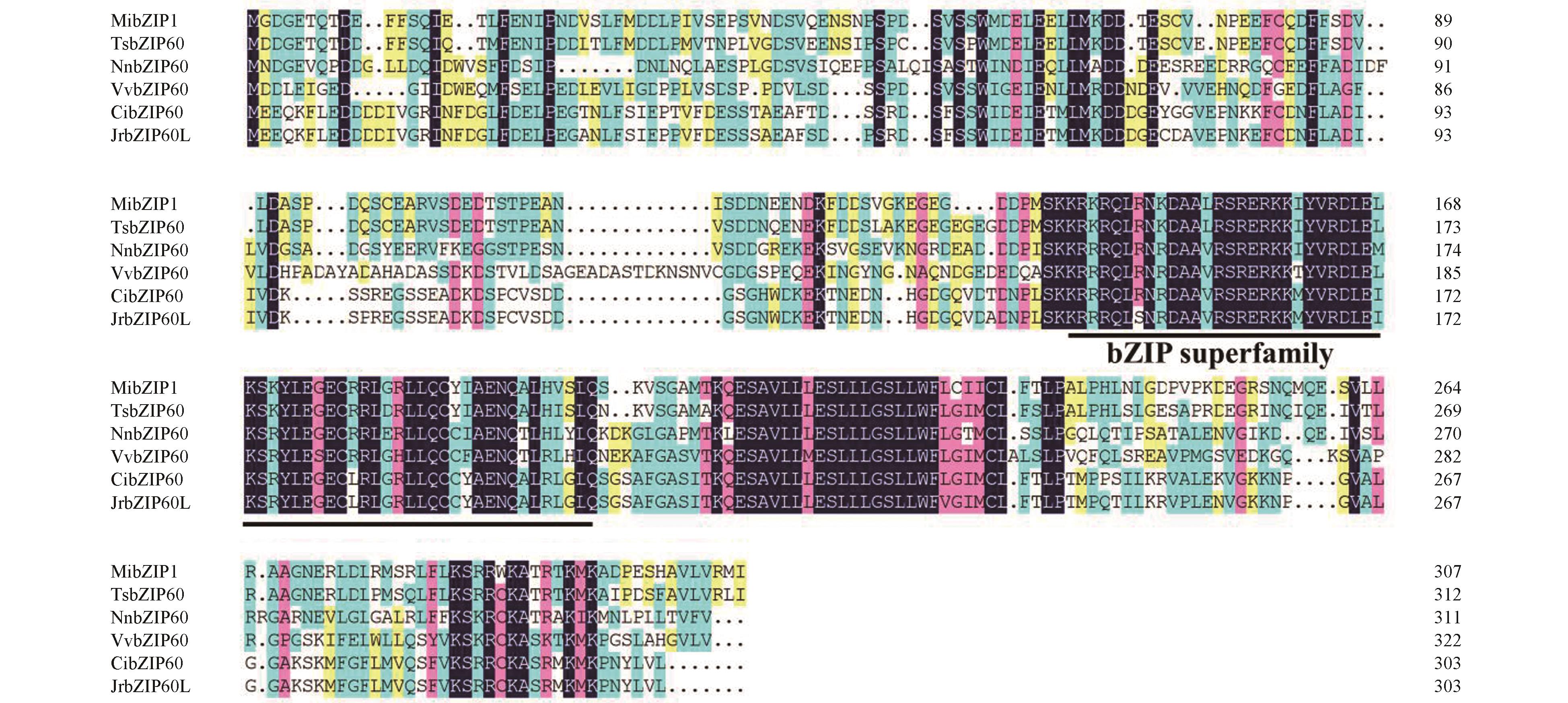 MibZIP1与其他物种bZIP转录因子的序列澳洲坚果MibZIP1(Macadamia integrifolia,XM_042651577.1);蒂罗花TsbZIP60(Telopea speciosissima,XP_043707929.1);荷花NnbZIP60(Nelumbo nucifera,XP_010270593.1);葡萄VvbZIP60(Vitis vinifera,XP_003634336.3);山核桃CibZIP60(Carya illinoinensis,XP_042991655.1);胡桃木JrbZIP60L(Juglans regia,XP_018832980.1)