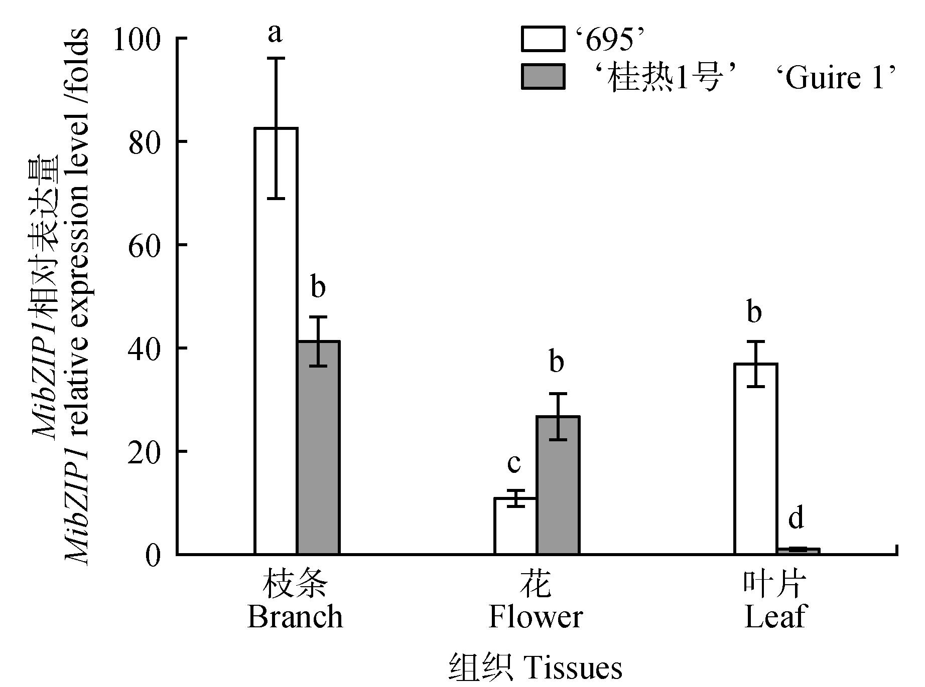 为研究澳洲坚果(Macadamia integrifolia)中bZIP转录因子家族成员在逆境抗性中潜在功能,从‘桂热1号’品种果实中克隆MibZIP1基因。结合转录因子结构分析和不同处理下表达规律进行分析发现MibZIP1基因序列长度1 157 bp,基因编码区长度927 bp,编码308个氨基酸。MibZIP1存在典型bZIP superfamily结构域。系统进化分析鉴定出澳洲坚果MibZIP1、蒂罗花(Telopea speciosissima)TsbZIP60和荷花(Nelumbo nucifera)NnbZIP60亲缘关系较近。组织表达分析结果表明MibZIP1在‘桂热1号’品种叶片中的表达量最低,在‘695’品种枝条中的表达量最高。其在受玉米素、水杨酸、乙烯利和脱落酸处理的“桂热1号”叶片中显著上调表达,在赤霉素和过氧化氢处理的“桂热1号”叶片中表达差异不显著。推测MibZIP1与澳洲坚果抗逆性有关,为研发澳洲坚果新型栽培和激素调控技术提供理论指导。