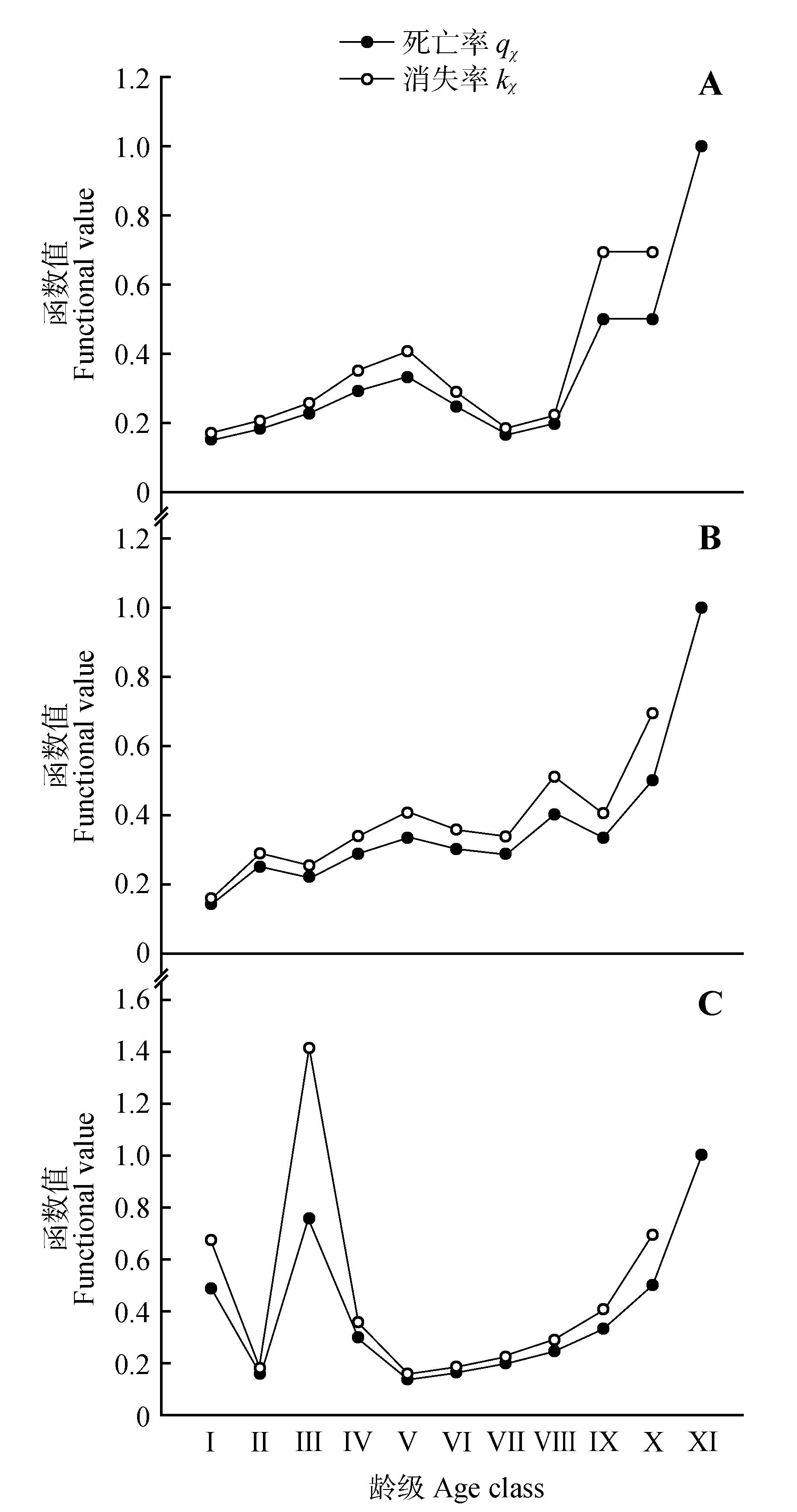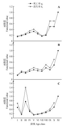 种群 Population | 龄级χ Age class | Aχ | aχ | lχ | lnlχ | dχ | qχ | Lχ | Tχ | eχ | Kχ |