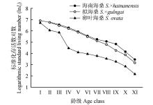 以3种海桑属(Sonneratia)濒危红树植物——海南海桑(Sonneratia × hainanensis)、拟海桑(S. × gulngai)、卵叶海桑(S. ovata)为研究对象,通过编制静态生命表,绘制存活曲线、死亡率和消亡率等曲线分析其种群结构,并用生存分析与时间序列对其未来的数量动态进行预测,以阐述其种群结构特征和动态变化规律,为海桑属濒危植物种群的保护和恢复提供基础资料和科学依据。结果显示:(1)卵叶海桑种群结构为增长型;而由于缺乏幼龄个体,海南海桑和拟海桑均为衰退型。(2)三者的种群存活曲线都表现为Deevey-Ⅱ型,各种群的死亡率和消失率曲线的变化趋势一致,并随着龄级的增加呈波状上升趋势,其中海南海桑和拟海桑均在老龄阶段遇到了障碍,而卵叶海桑幼龄个体的发展遇到了瓶颈。(3)海南海桑和拟海桑种群自我更新能力较差,未来种群数量将逐渐衰退。卵叶海桑种群具有良好的恢复潜力,未来种群数量将逐步增加,但由于其种群个体数随龄级增加呈衰减趋势,若继续保持这种态势,将有可能导致龄级断层现象。(4)人类的养殖活动导致原有生境破碎化,产生了一系列不适宜种子萌发与幼苗生长的环境因子(光照、盐度、潮汐等),这在很大程度上抑制了海桑属濒危植物种群的自然更新。建议在加大天然种群就地保护力度的基础上,优化迁地保护策略和科学实施野外回归,并积极开展人工辅助育种工作,突破育种难题,以保证其种群的正常更新。