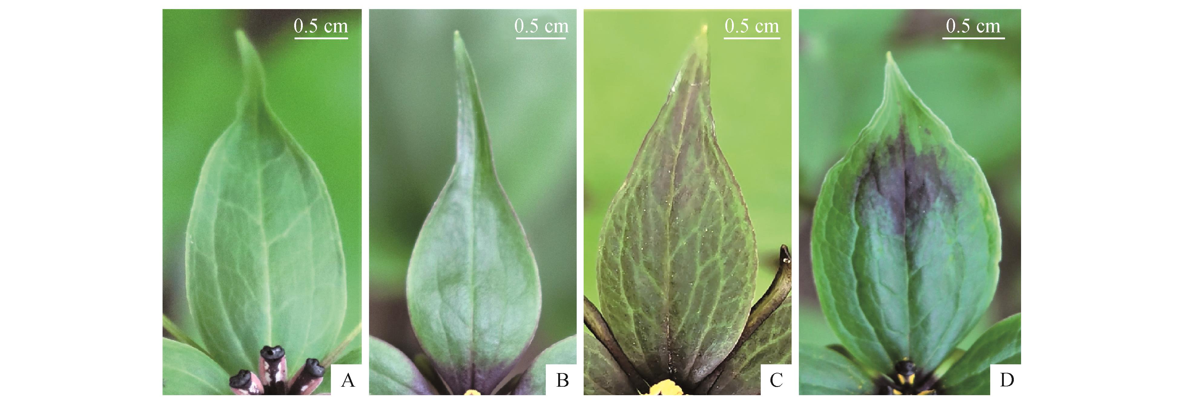金线重楼 P. delavayi var. delavayi | 长Length:1.5~4.1 cm 宽Width:0.3~1.0 cm | 明显向下反折 Fold obviously downward | 紫黑色或稍带绿色 Purple black or slightly green | <1/2 | — | 5~9 | 狭披针形、卵状披针形 Narrow lanceolate,ovate lanceolate |