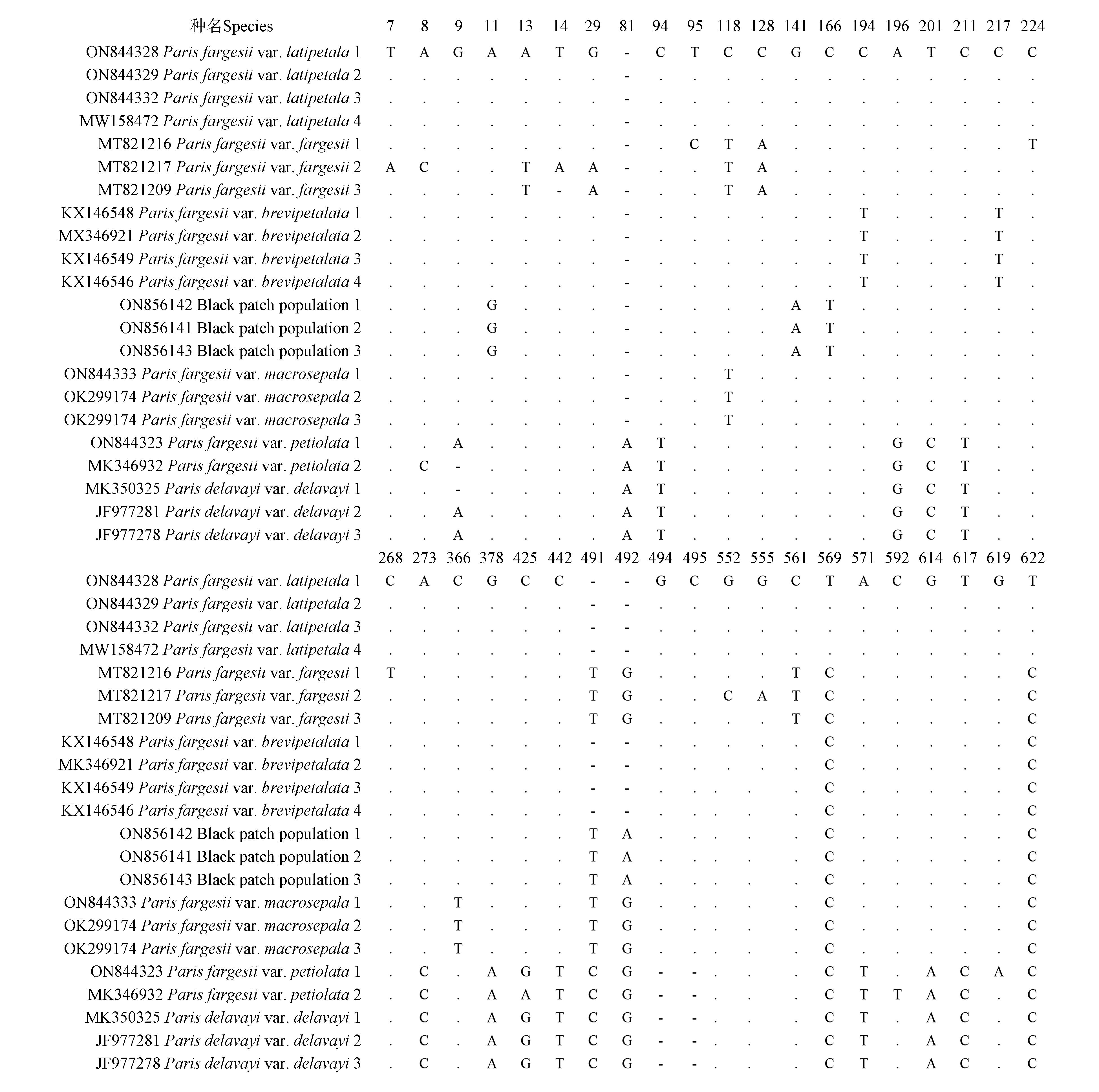 球药隔黑斑种群 Black patch population | 长Length:2.4~5.4 cm 宽Width:0.8~2.9 cm | 平展或稍向下反折 Flatten or fold slightly downward | 绿色(近先端具紫黑色斑块) Green(Nnear apex with purple black patches) | <1/2 | 长度比Length ratio:2.86~3.95 宽度比Beam ratio:4.12~6.74 | 3~5 | 卵形、卵状长圆形、卵状披针形 Ovate,ovate oblong and ovate lanceolate |