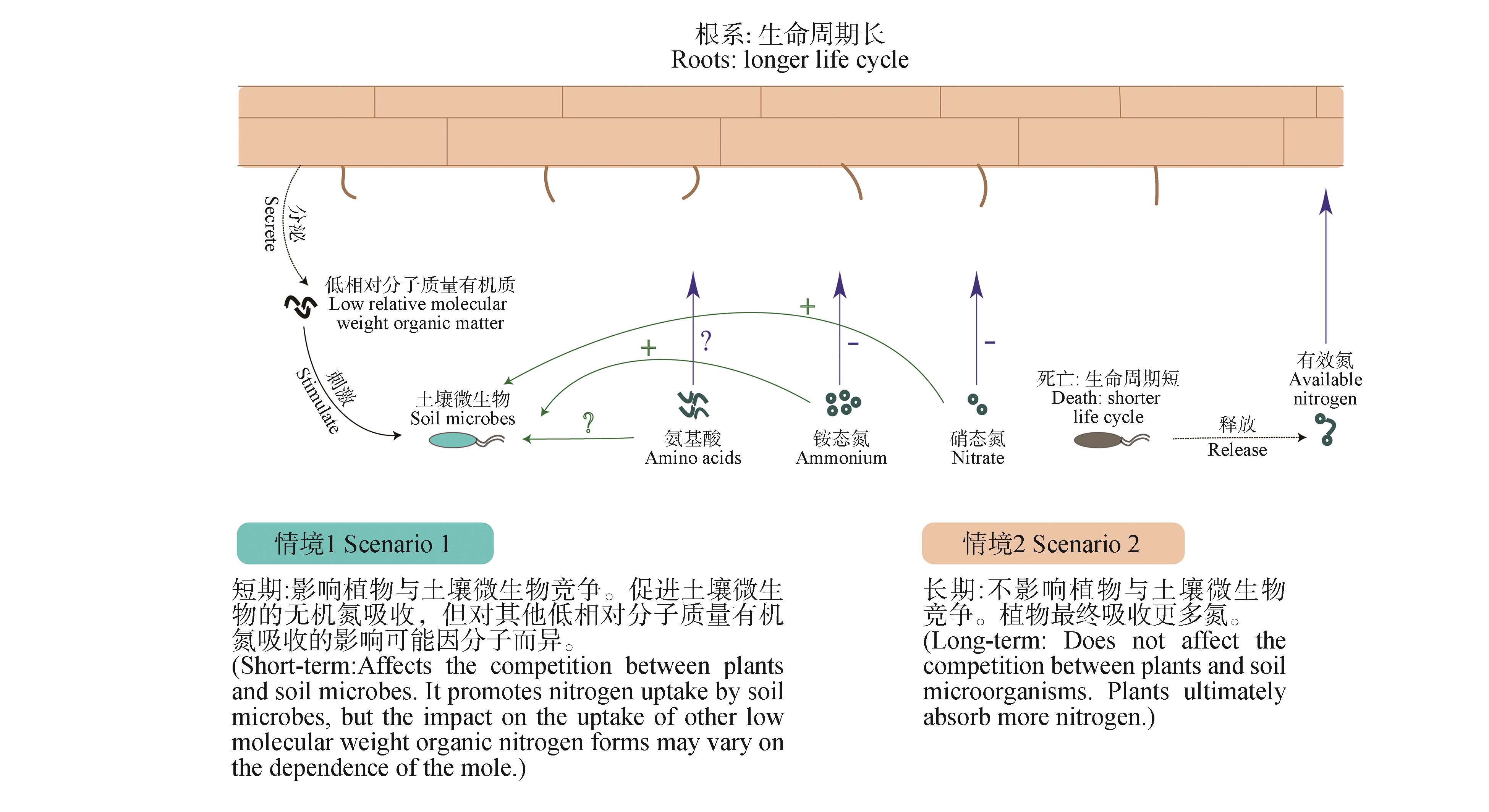 植物吸收土壤氮的过程及其多维度策略对生态系统生物多样性和碳汇功能具有重要影响。该文系统回顾了植物氮营养理论发展历程,介绍了矿质营养理论和矿质-有机营养理论,重点阐述了植物对土壤氮吸收的多维度策略,主要涉及4个方面:(1)多形态氮吸收,这既包括铵态氮和硝态氮,也包括一系列低相对分子质量有机氮,如氨基酸、氨基糖和寡肽等;(2)季节性吸收,植物对土壤多形态氮吸收数量和模式具有显著的季节性变异,不同植物的吸收规律可能存在差异;(3)土层分化吸收,根系构型及土壤有效氮在土壤垂直层次的变异影响植物对土壤不同层次氮量及氮形态的吸收;(4)共生方式分化吸收,固氮细菌、菌根真菌及深色有隔内生真菌等促进植物氮吸收,并在一定程度上影响植物对不同形态氮的获取。综上,植物氮吸收的多维度策略是生态系统植物共存和生态位分化的基础,在缓解植物种间竞争、减少氮损失及提高生态系统氮利用效率等方面发挥重要作用。目前,对植物氮吸收策略的研究尚有不足,与之相关的一些关键科学问题亟待解决,如原位土壤有效氮的含量与动态,不同土壤有效氮的周转差异,植物氮吸收策略的分子生物学机制,以及不同有效氮对植物氮营养的贡献等。
