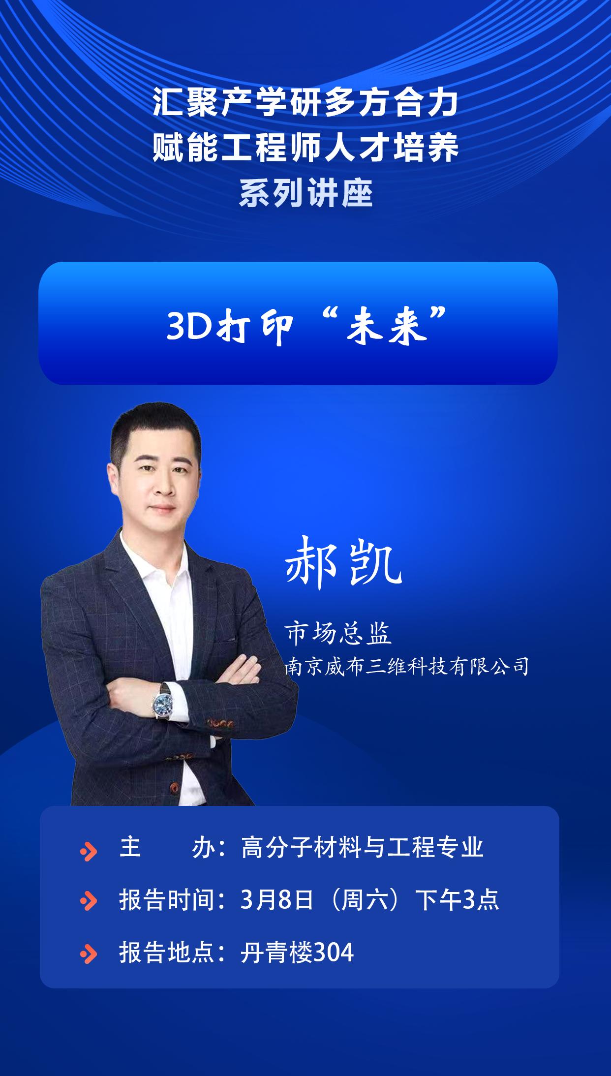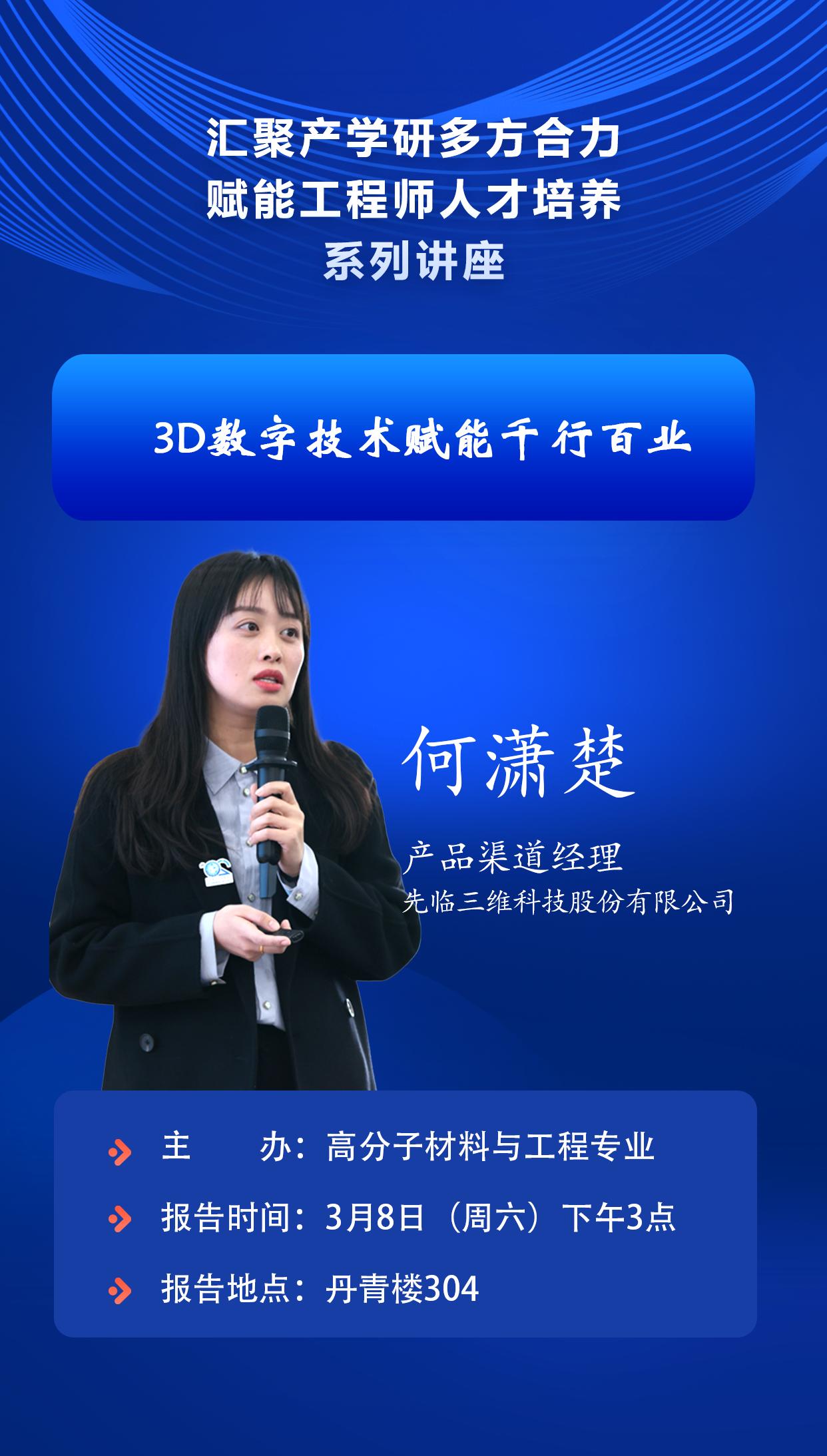 2025年3月8日下午3点在丹青楼304,高分子材料与工程专业特邀南京威布三维科技有限公司市场总监郝凯、先临三维科技股份有限公司产品渠道经理何潇楚做客报告厅,为师生带来"3D数字扫描及3D打印技术赋能千行百业"专题报告会,深度解读3D数字扫描技术如何赋能千行百业,揭开3D打印蕴藏的无限 “未来”,共同探索材料学科与先进制造技术的融合创新。