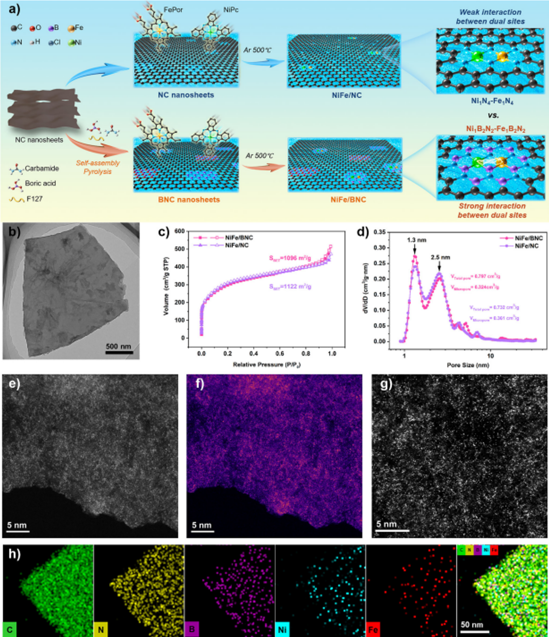 本研究通过引入类金属B并构筑B、N共配位的双原子位点结构,提出了一种增强双金属位点之间电子协同作用的策略。以Ni-Fe双原子催化剂为例,NiFe/BNC催化剂在MEA电解池中表现出优异的CO2还原性能,在200 mA·cm-2电流密度下CO的法拉第效率(FECO)达到99%,全电池能量效率为55.7%,明显优于传统氮配位的NiFe/NC催化剂。在电解池面积为100 cm2的MEA电解池中,该催化剂在1-6 A的电流下仍保持95%以上的FECO。此外,该催化剂在极端条件下(−53 ℃、50-250 mA·cm-2)亦具有较好的CO2电解性能,FECO仍可保持在98%以上。通过一系列的表征测试与DFT计算研究发现,与弱相互作用的NiFe/NC催化剂相比,B、N共配位结构诱导了Fe向Ni的电子转移过程,形成富集电子Ni位点,利于*COOH中间体的生成,而失去电子的Fe位点则更利于CO的脱附,二者的协同作用进一步提升了CO2还原性能。该设计策略已成功扩展至多种双金属体系,为双原子催化剂的设计提供了新的思路。