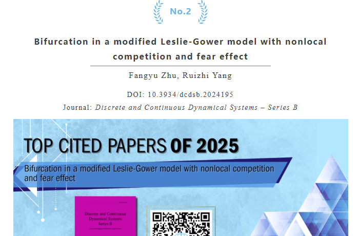 近日,我校理学院微分方程与生物数学团队杨瑞智教授与其研究生朱芳宇在生物数学与动力系统领域的研究取得重要研究进展。他们合作完成的论文“BifurcationinamodifiedLeslie-Gowermodelwithnonlocalcompetitionandfeareffect”发表于国际权威期刊DiscreteandContinuousDynamicalSystems-SeriesB,并入选美国数学科学研究所(AIMS)发布的“2025年度高被引论文TOP10”,位列第二。这一成果正是学校基础研究服务国家战略取得“标志...