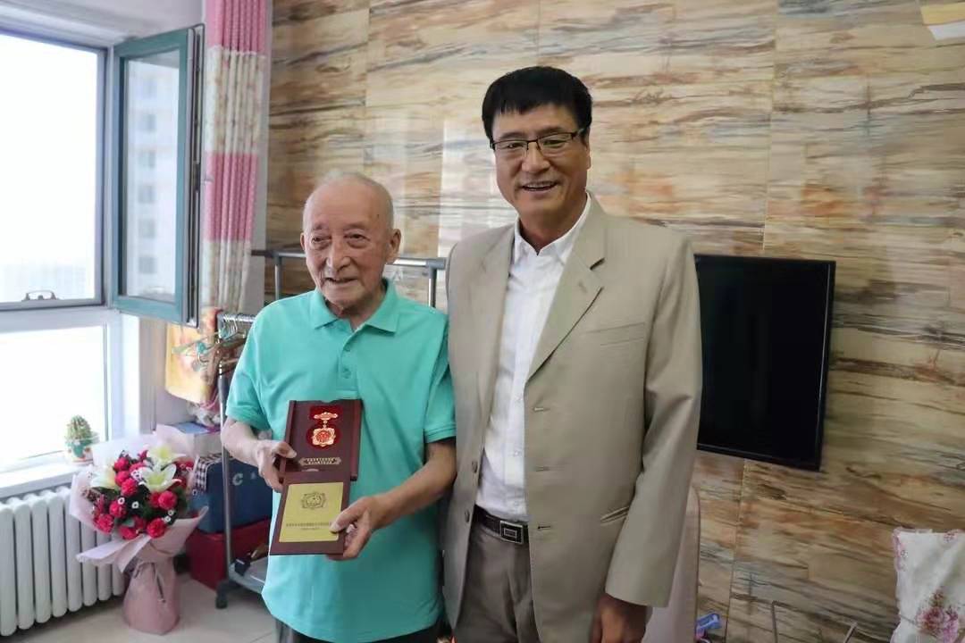 刘志喜老先生今年已经100岁了,他精神矍铄,思维清晰,老先生向赵主委和张书记表达了谢意,感谢祖国和党没有忘记他们这些为国家经济发展做出贡献的老盟员,感谢盟组织的关怀和学校的厚爱。他表示,党中央将这一枚具有重要纪念意义的奖章颁发给他,是他这一生收到的最珍贵的礼物,一定要好好珍藏这一份荣誉。