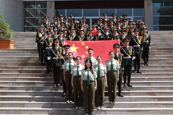 在校运动会的操场上,经历了一年早出晚归的艰苦训练之后,国旗仪仗队队员和朝夕相伴的国旗合影,为自己大学生活画上浓墨重彩的一笔。