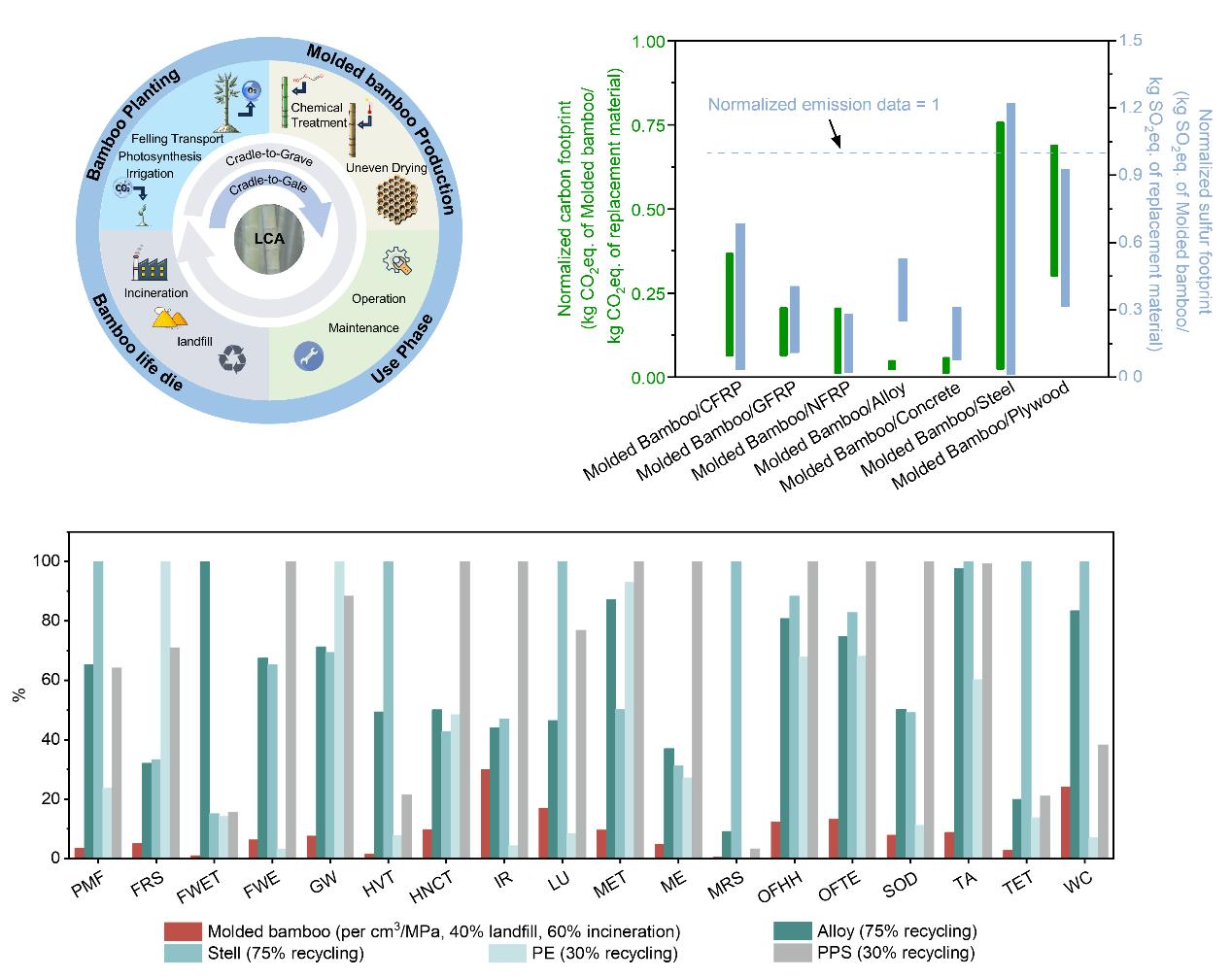 生命周期评估显示,3D竹材的生产碳排放仅为钢材的30%–50%,碳纤维复合材料的15%左右。若以强度为基准,与铝合金、聚乙烯和聚苯亚硫酸盐等可回收材料相比,3D竹材在化石资源稀缺性、淡水生态毒性、海洋富营养化和陆地酸化等方面具有显著优势,其广泛的低环境影响将助力于实现全球碳达峰和碳中和。