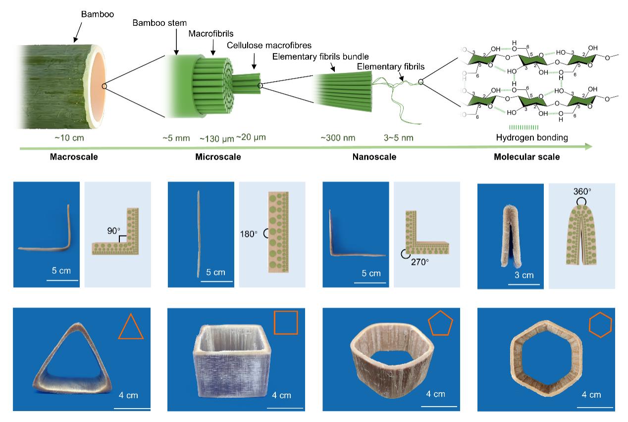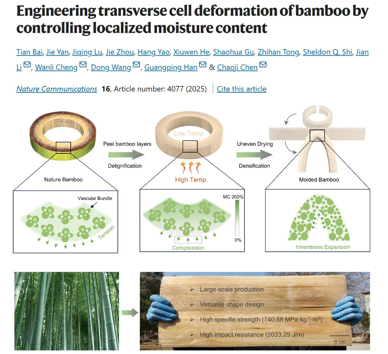 竹子能否像金属和碳纤维那样,被精确塑形并承担高强度结构使命?星空游戏免费版下载联合武汉大学给出了肯定答案。该团队基于传统的干燥理论,提出“局部水分梯度驱动的非均匀干燥”策略,实现了竹材横向的细胞可控变形,可将天然圆竹加工成任意三维(3D)结构构件,并在力学性能与碳足迹上同时超越了多种传统工程材料。相关研究以“Engineering transverse cell deformation of bamboo by controlling localized moisture content”为题,发表于《Nature Communications》期刊,星空游戏免费版下载博士研究生白天为第一作者,李坚院士、程万里教授、王栋副教授、韩广萍教授及陈朝吉教授为共同通讯作者。