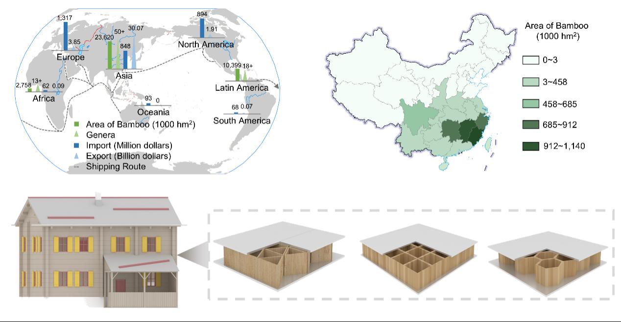 图4.竹资源的全球分布及3D竹材的应用。