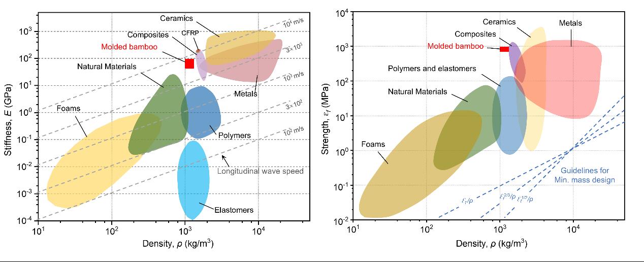 研究表明,3D竹材比强度最高达740.58 MPa kg-1m3,接近航空级碳纤维复合材料;冲击韧性为2033.29 J/m,其冲击吸能能力远高于常用钢材和铝合金,可应用于多种承受动态载荷的场景。