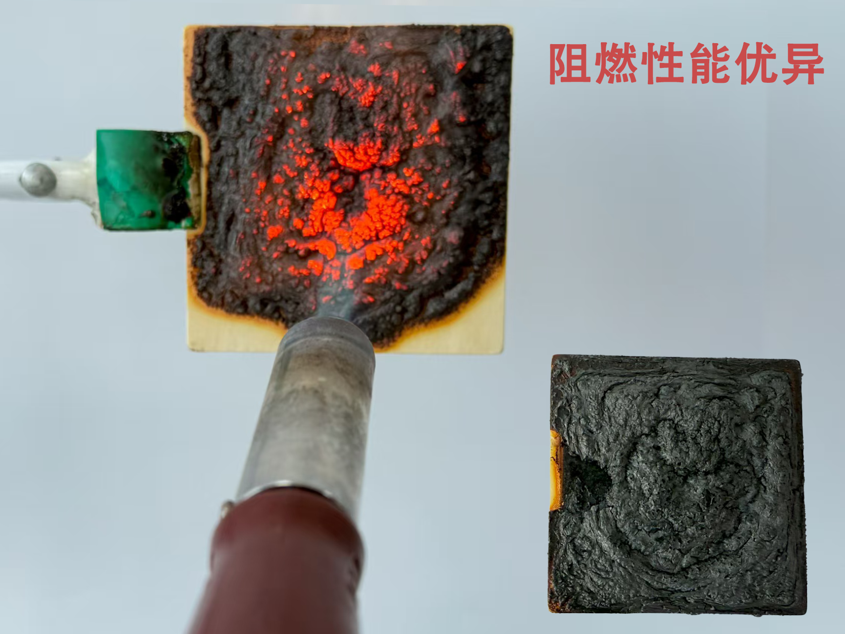 本产品是一款以绿色生物质材料为核心阻燃成分的双组份型水性阻燃涂料,集环保性、高效性与经济性于一体,符合可持续发展理念。主要适用于木制家具、装饰、建筑等产品的表面防护与阻燃处理。产品施工方便,可采用喷涂、刷涂、辊涂等方式,施工后6小时即可硬干。透明度佳,透光率高达95%,不影响基材原有外观。铅笔硬度高达6H,且达到V0级附着力等级,耐磨耐刮且结合牢固。防水性能出色,浸水14天无开裂、无起泡等现象。阻燃性能优异,通过UL94垂直燃烧V0级认证,大板燃烧测试中持续阻燃时间超过15分钟,表现出极强的火焰抑制与自熄能力。同时作为一种环境友好、价格低廉、综合性能优异的透明阻燃涂料,本产品成本显著低于市场同类产品,单价仅每公斤3.5元,特别适用于公共设施等领域的高标准防火需求。