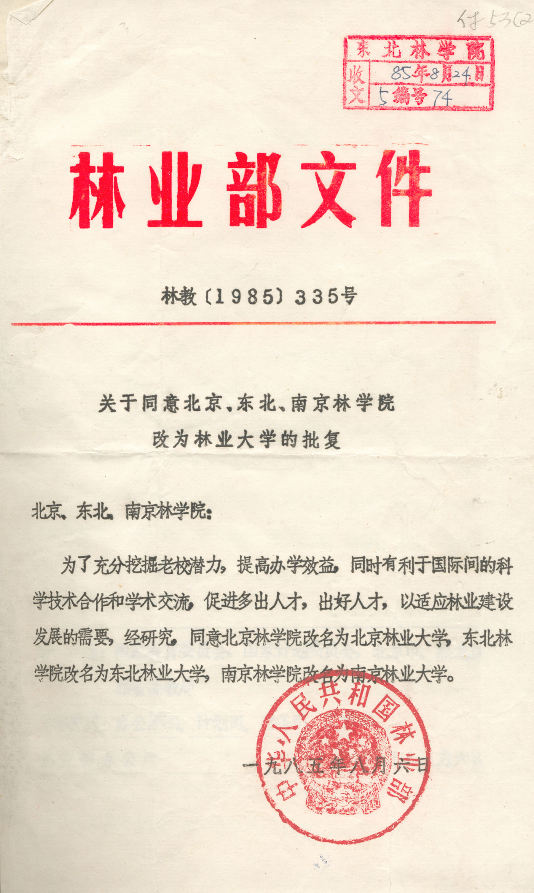 1985年8月31日下午,学校在主楼前隆重举行更名仪式。党委书记王世林,校长修国翰,副校长朱国玺、李荣久,党委副书记李希明和部分师生参加了更名仪式。修国翰校长讲了话,他阐述了我校改名的重要意义,号召全校师生共同努力,把我校办成第一流的林业大学。