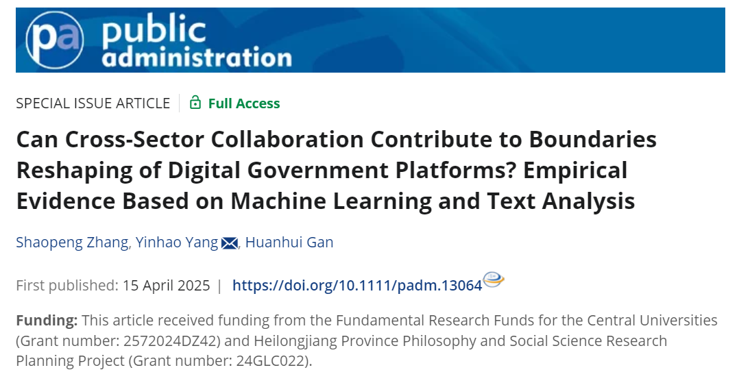 近日,我校经济管理学院张少鹏副教授在数字政务平台治理研究领域取得重要突破,研究成果以“跨部门合作能否助力数字政务平台边界重塑?——基于机器学习与文本分析的经验证据”为题,发表于国际权威期刊、公共管理学顶级期刊《公共管理》(Pubic Administration)(SSCI一区,ABS 4星)。