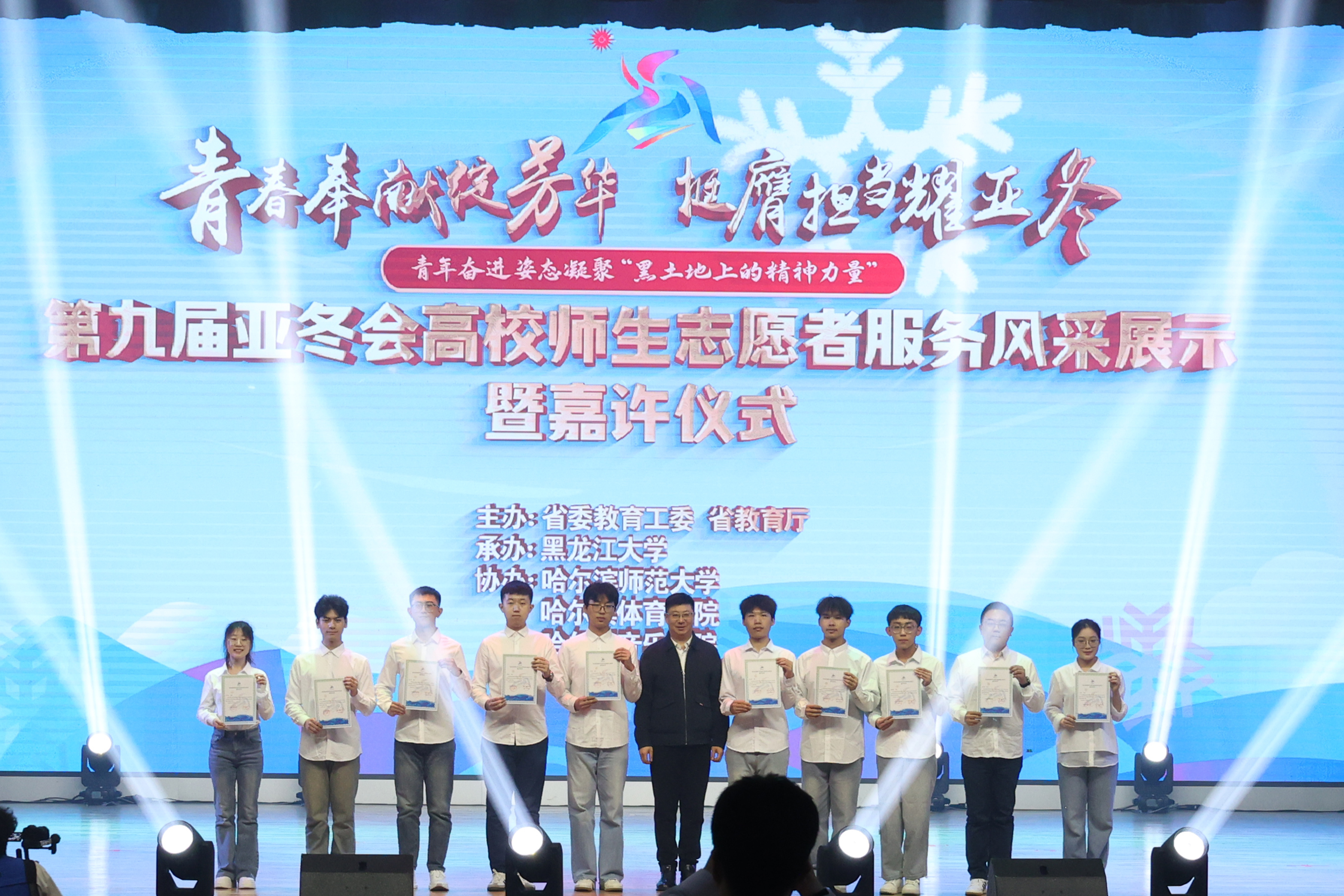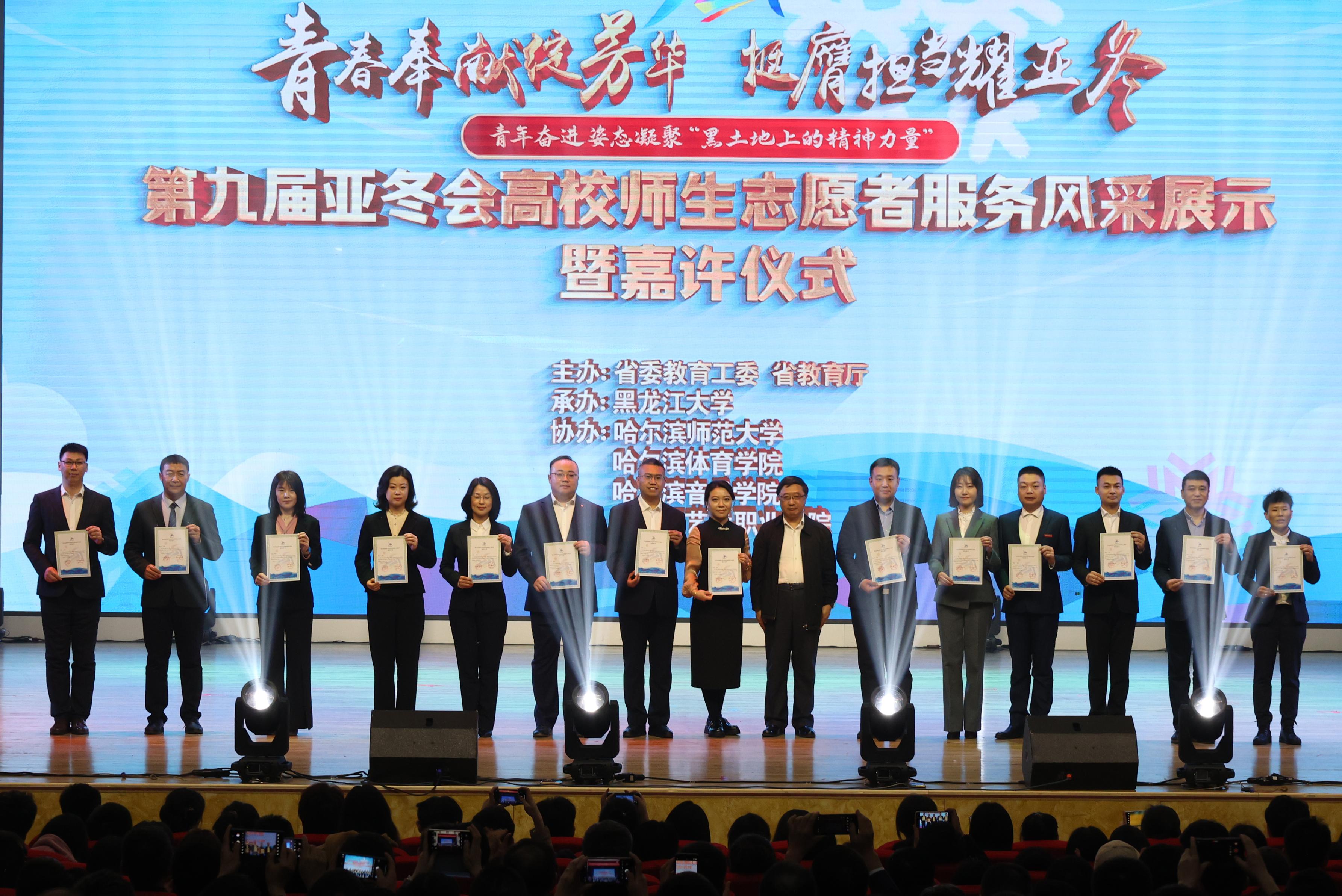 4月9日下午,第九届亚冬会高校师生志愿者服务风采展示暨嘉许仪式圆满举行,学校党委常委、副校长张春雷和28位获奖师生一同参加活动。