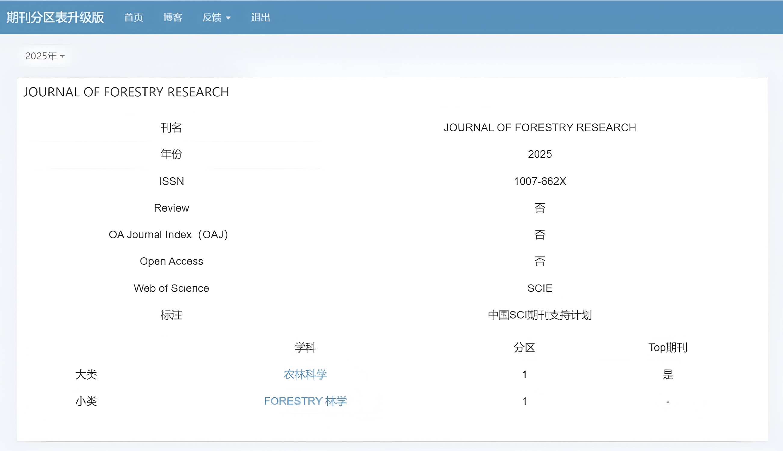 3月20日,中国科学院文献情报中心正式发布《2025年中国科学院文献情报中心期刊分区表》,星空游戏免费版下载英文学术期刊《林业研究(英文)》(Journal of Forestry Research)取得历史性突破,位列中科院一区、Top期刊!