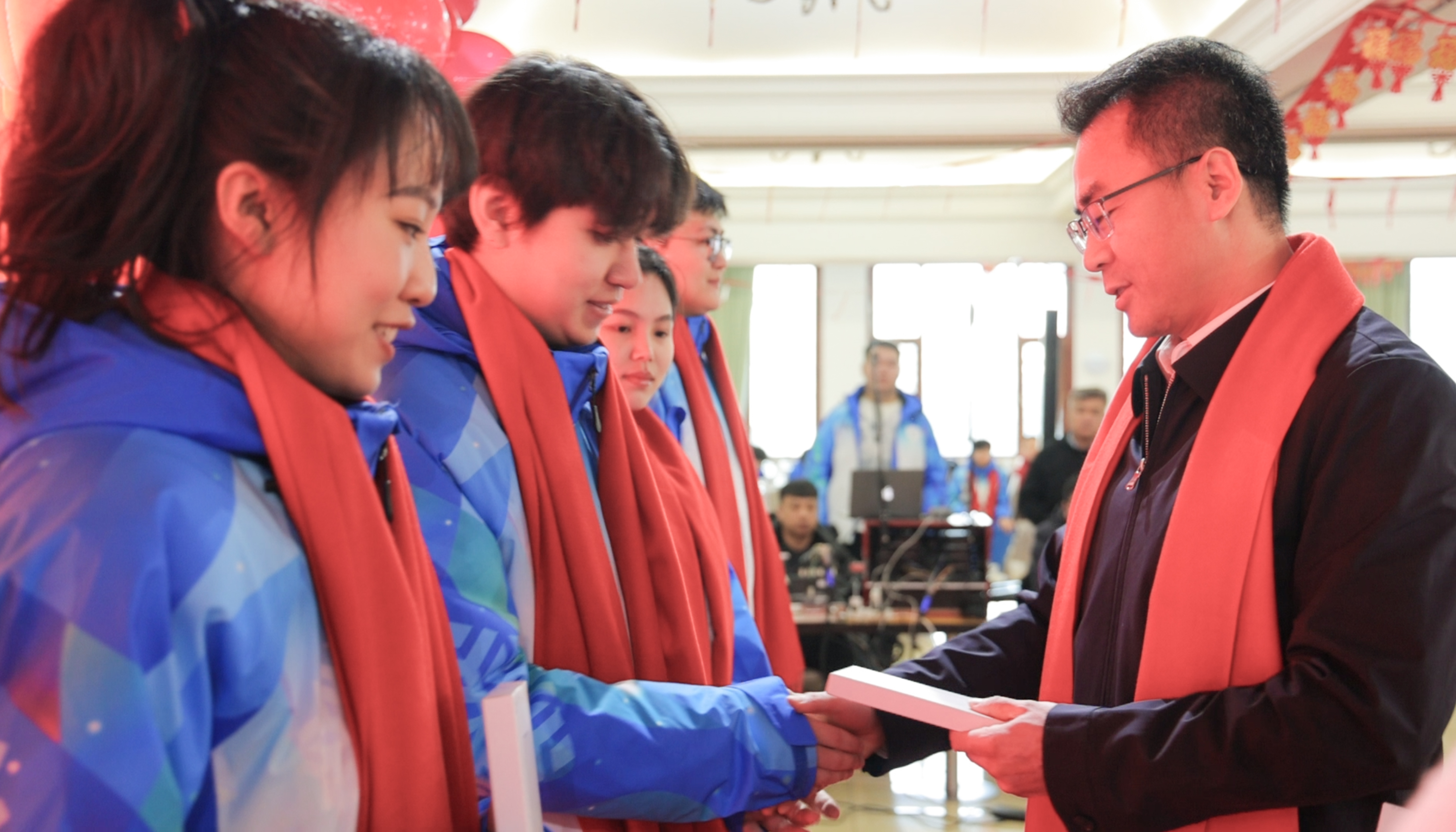 孙猛书记、张春雷副校长代表学校向留校参与亚冬会服务的志愿者代表们送上了新年大礼包,礼包中既包括了“尔滨”特色美食,也有学校为志愿者们精心定制的充电宝,希望志愿者们满电出发,活力满满。