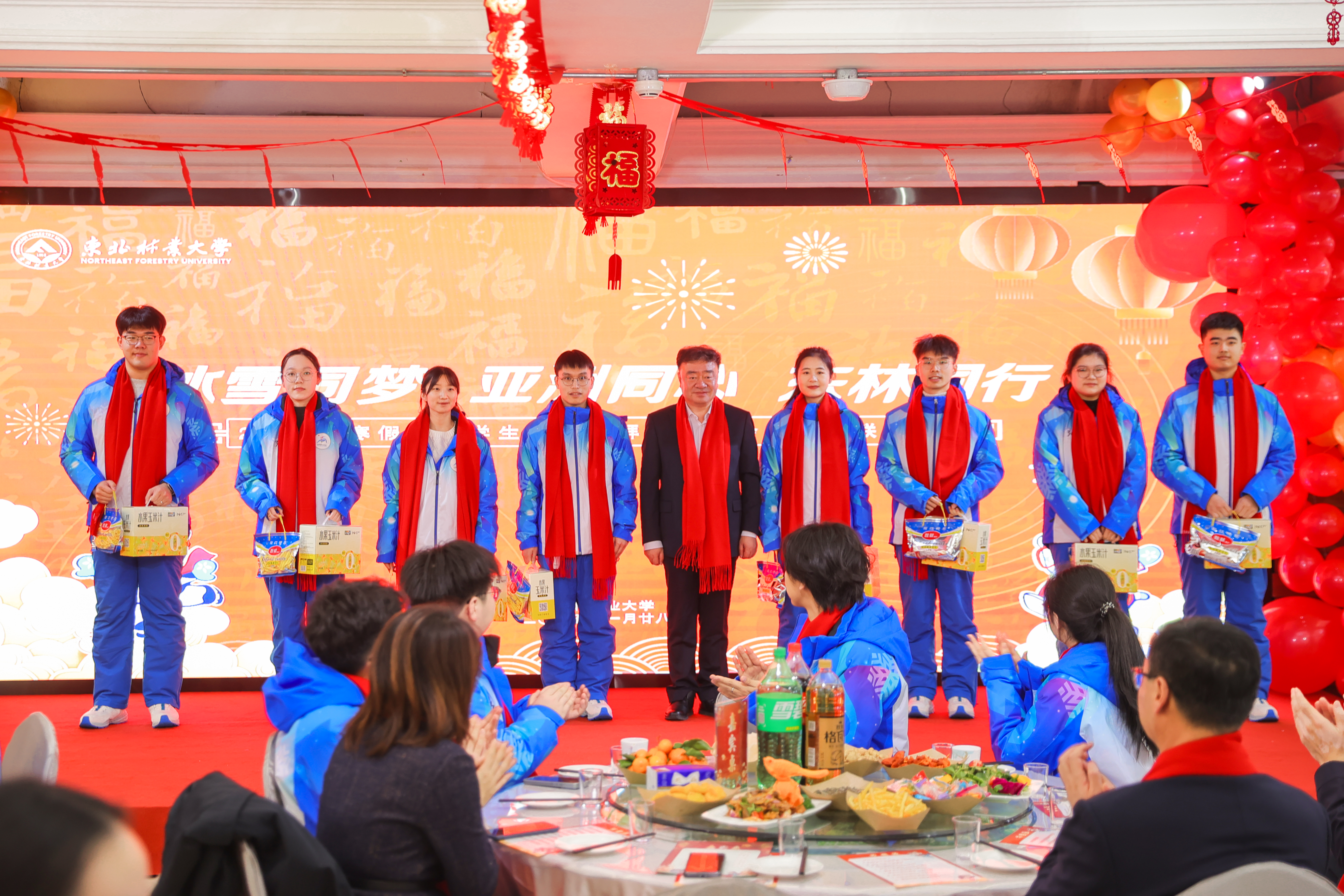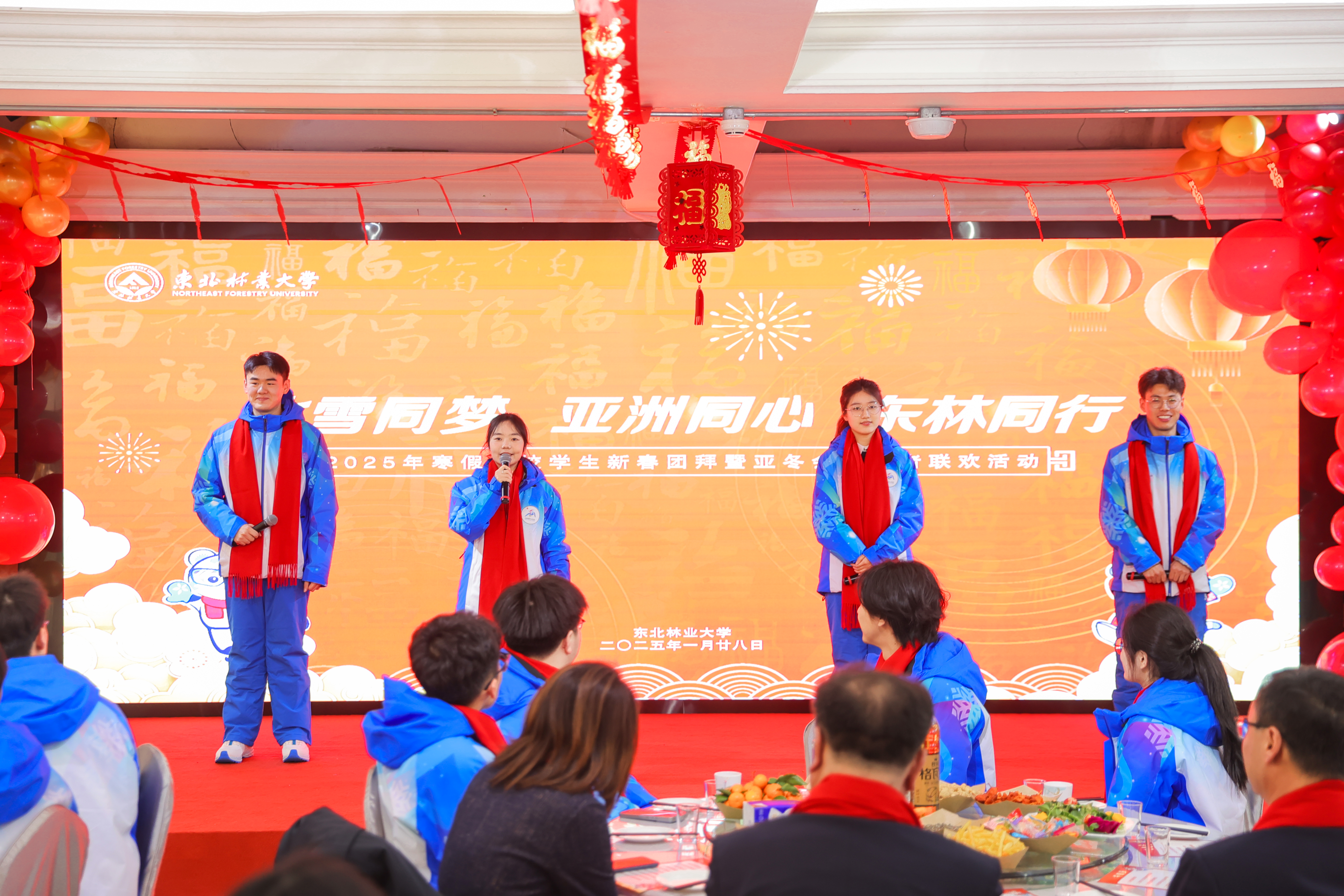 金蛇献瑞,蛇舞新春。1月28日,传统的除夕佳节,学校在俭德园四楼餐厅举行2025年寒假留校学生新春团拜暨亚冬会志愿者联欢活动。学校党委书记孙猛,校长宋文龙,党委常委、副校长张春雷与300余名留校学生共度除夕。
