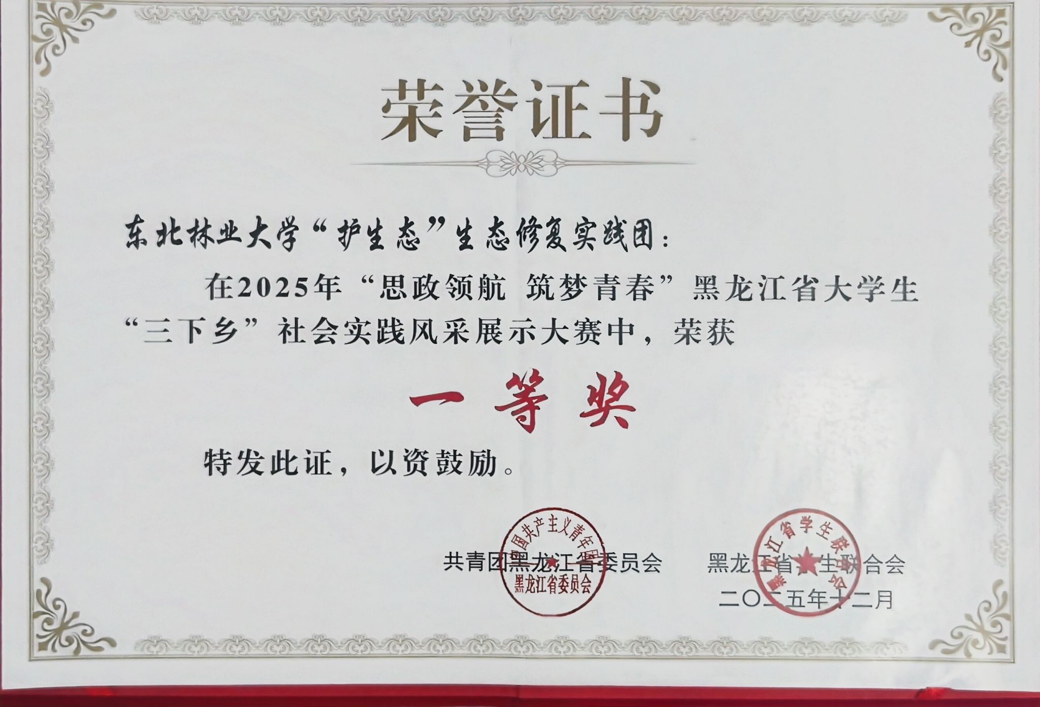 近日,2025年“思政领航 筑梦青春”黑龙江省大学生“三下乡”社会实践风采展示 活动在黑龙江大学举办。本次大赛由团省委、省学联组织开展,自9月启动以来,通过校地推荐、线上初评、线下决赛,我校“护生态”生态修复实践团获评一等奖并现场宣讲,“松江源・生态行”实践团获三等奖。