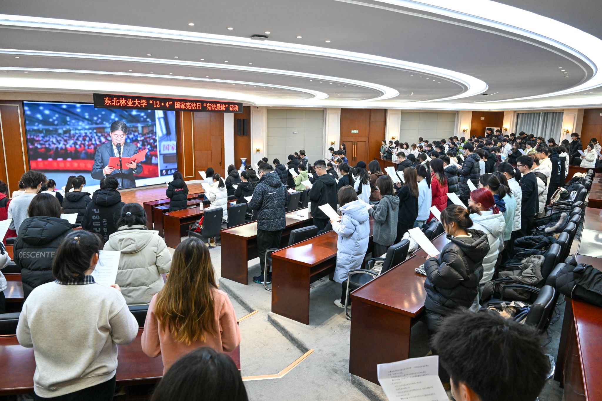 为深入贯彻党的二十大和二十届历次全会精神,学习贯彻中央全面依法治国工作会议精神,贯彻落实习近平法治思想和习近平总书记关于宪法法治教育的重要指示精神,12月4日上午,在第十二个国家宪法日到来之际,学校在综合办公楼11楼会议室设立主会场,国际会议厅(动保楼331会议室)设立分会场,举行第十五次党委理论学习中心组集体学习(扩大)暨国家宪法日“宪法晨读”活动。学校党委理论学习中心组成员以及机关各职能处室的教职工代表、各学院学生代表400余人现场参与本次活动。各单位根据自身实际,同步组织师生收看网络直播。