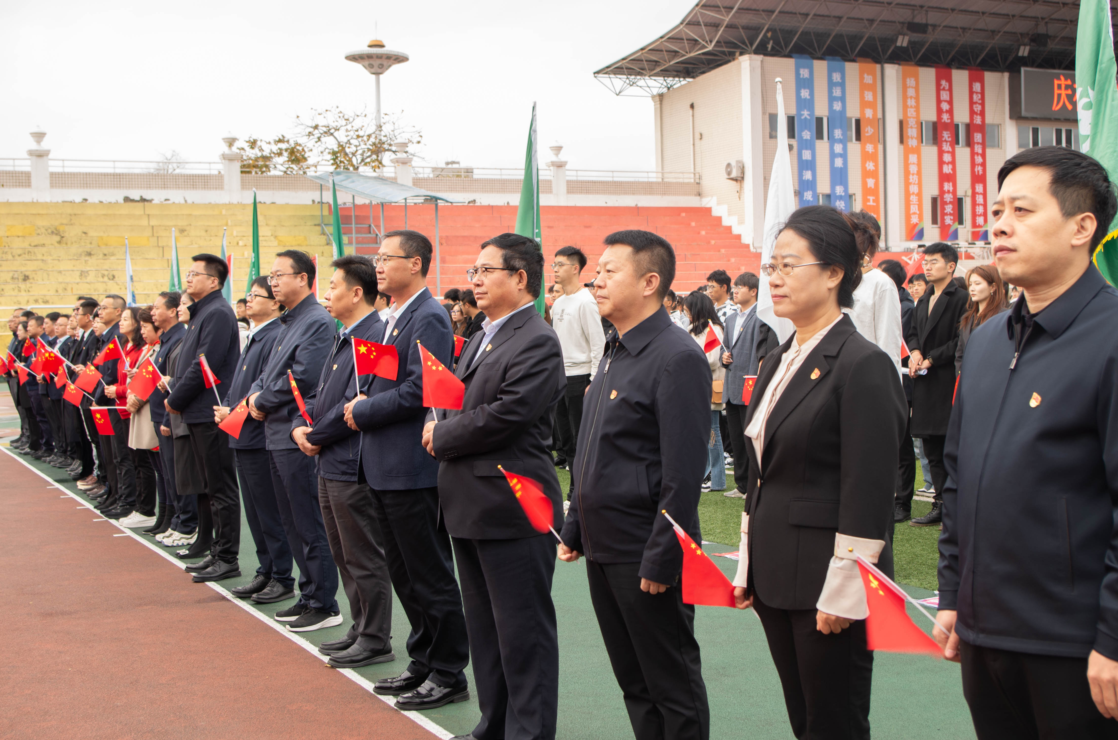 仪式结尾,随着《歌唱祖国》熟悉的旋律响起,学校领导走上主席台带头领唱,全场师生挥舞红旗齐声高唱。在各学院旗手的带领下,全场瞬间变成了红色的海洋,学生打出的“我爱你中国 我爱你东林”字样与飘动的红旗交相辉映,在人群中分外醒目,整场升旗仪式也在挥舞的国旗和激昂歌声中落下帷幕。