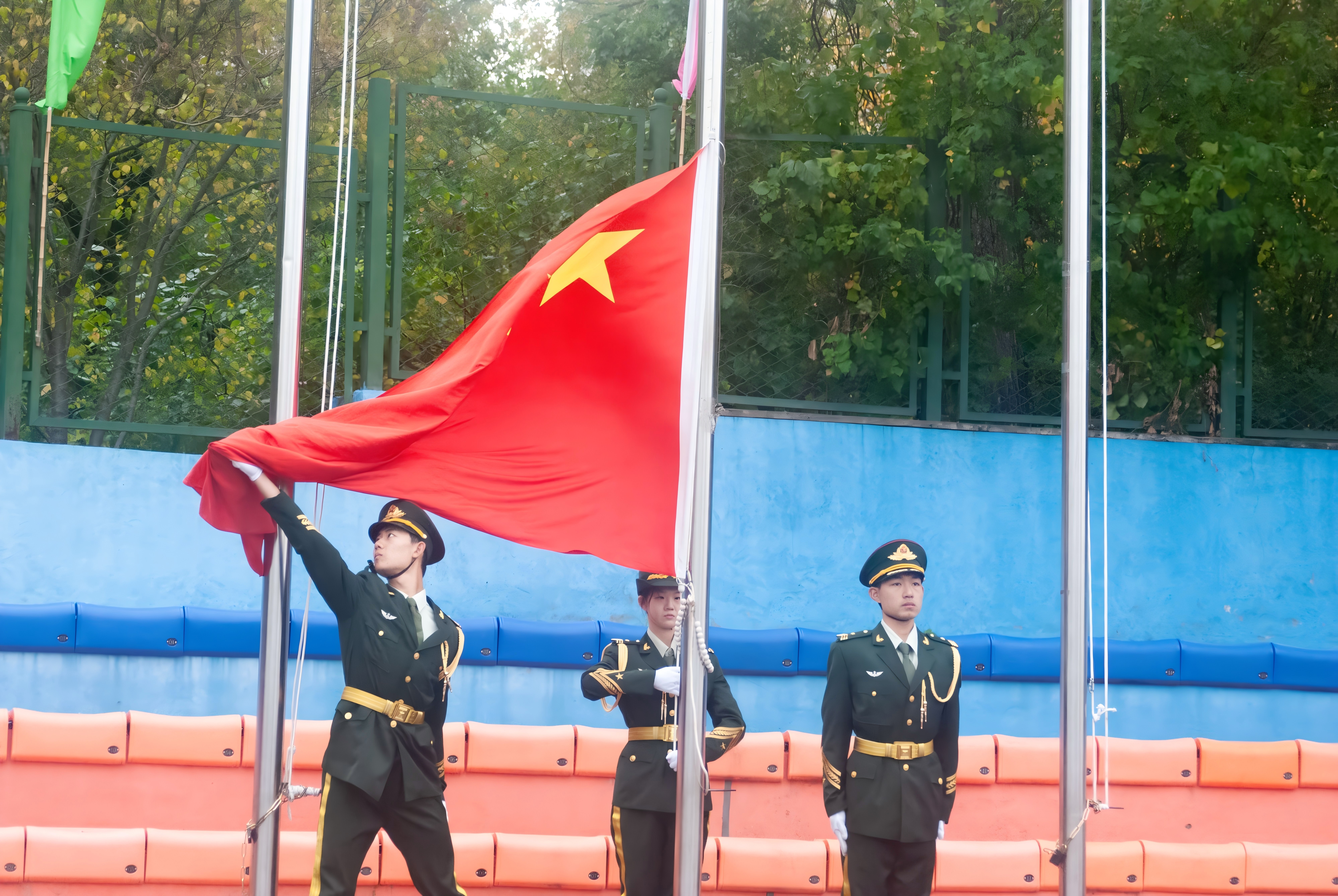 全体师生整齐列队迎接国旗,学校国旗仪仗队以铿锵有力的步伐,护送国旗走向升旗台。伴随雄壮的《义勇军进行曲》,五星红旗冉冉升起,迎风飘扬,全场师生行注目礼,高声齐唱国歌。
