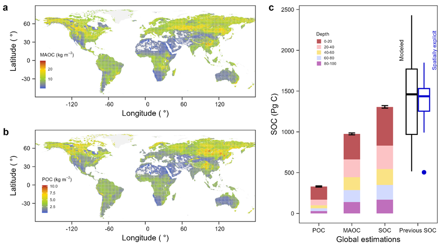 本研究首先使用机器学习方法绘制了土壤不同深度(0–20、20–40、40–60、60–80、80–100 cm)矿物结合有机碳和颗粒有机碳的全球分布图谱。发现土壤矿物结合有机碳和颗粒有机碳的全球储量分别为975 Pg C和330 Pg C(图1)。该全球分布图谱为碳循环研究领域提供关键的数据产品,可以有效推动土壤碳循环模型的发展。