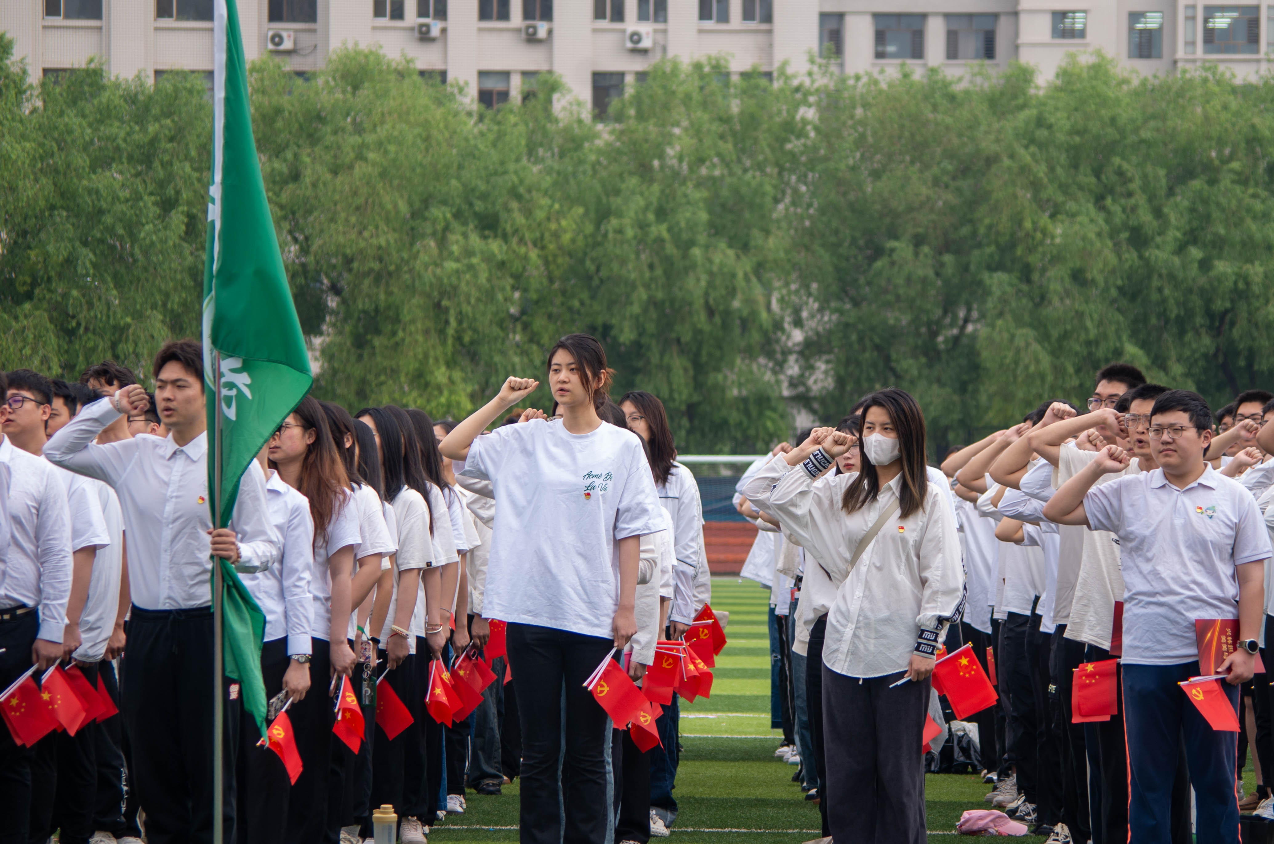 活动尾声,在场全体师生齐声高唱校歌,手中的国旗与党旗随风飘扬。