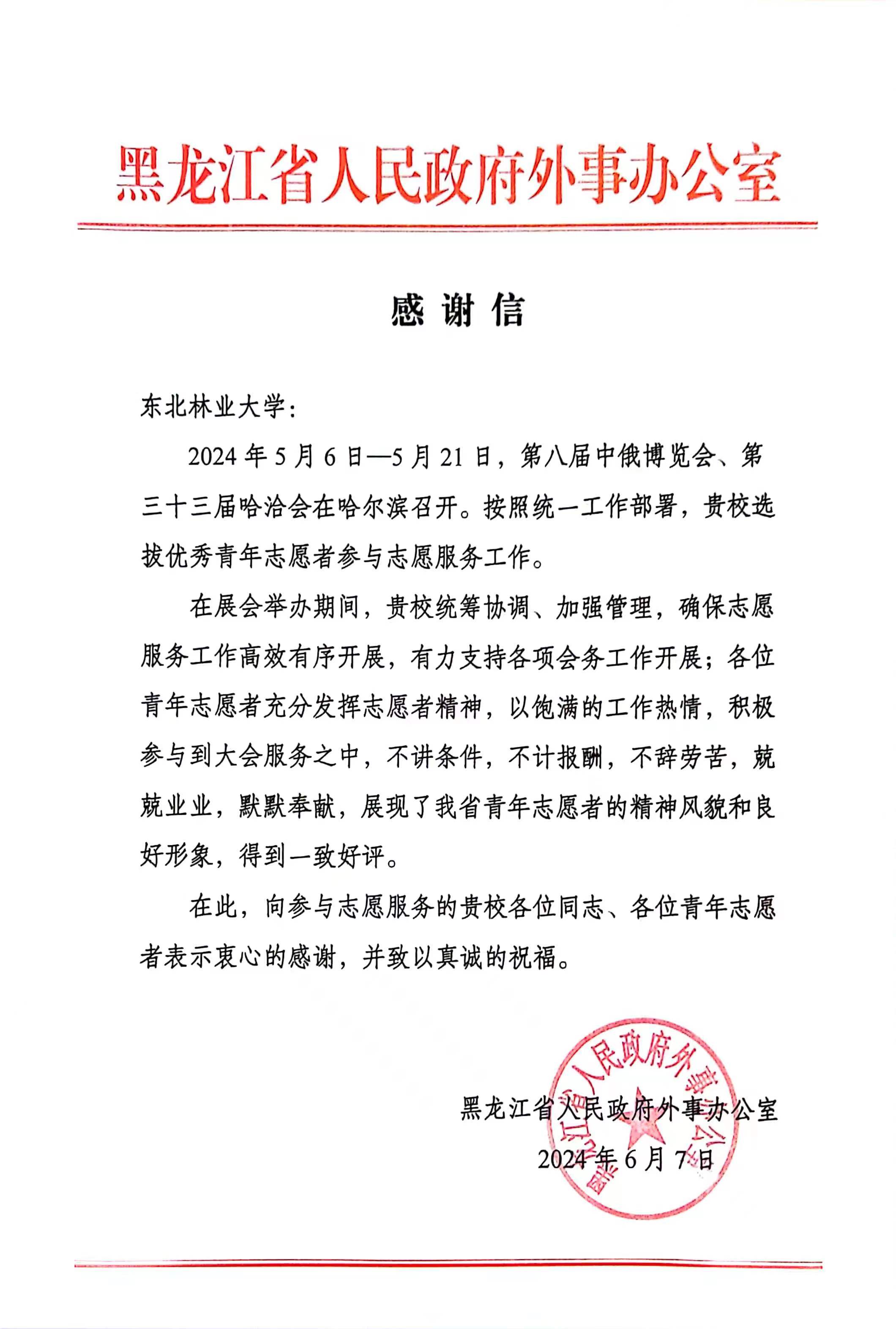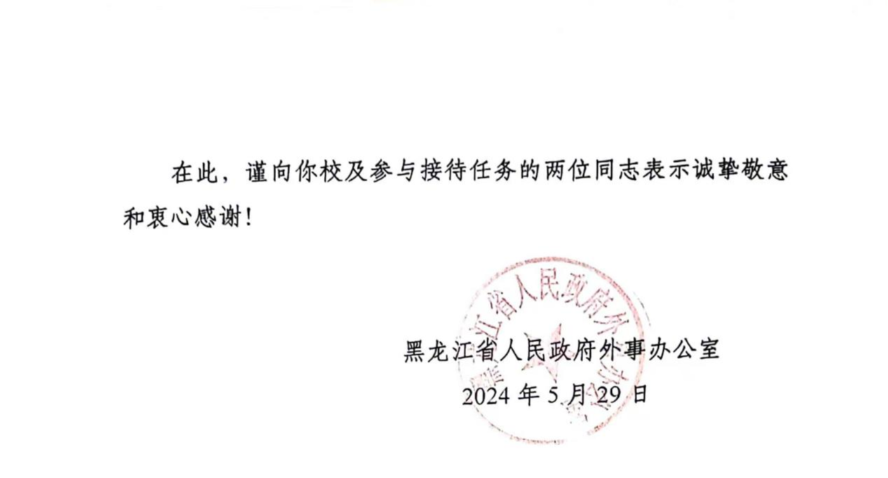近日,我校收到黑龙江省人民政府外事办给我校发来的感谢信,感谢我校学子在第八届中俄博览会期间的优秀表现。