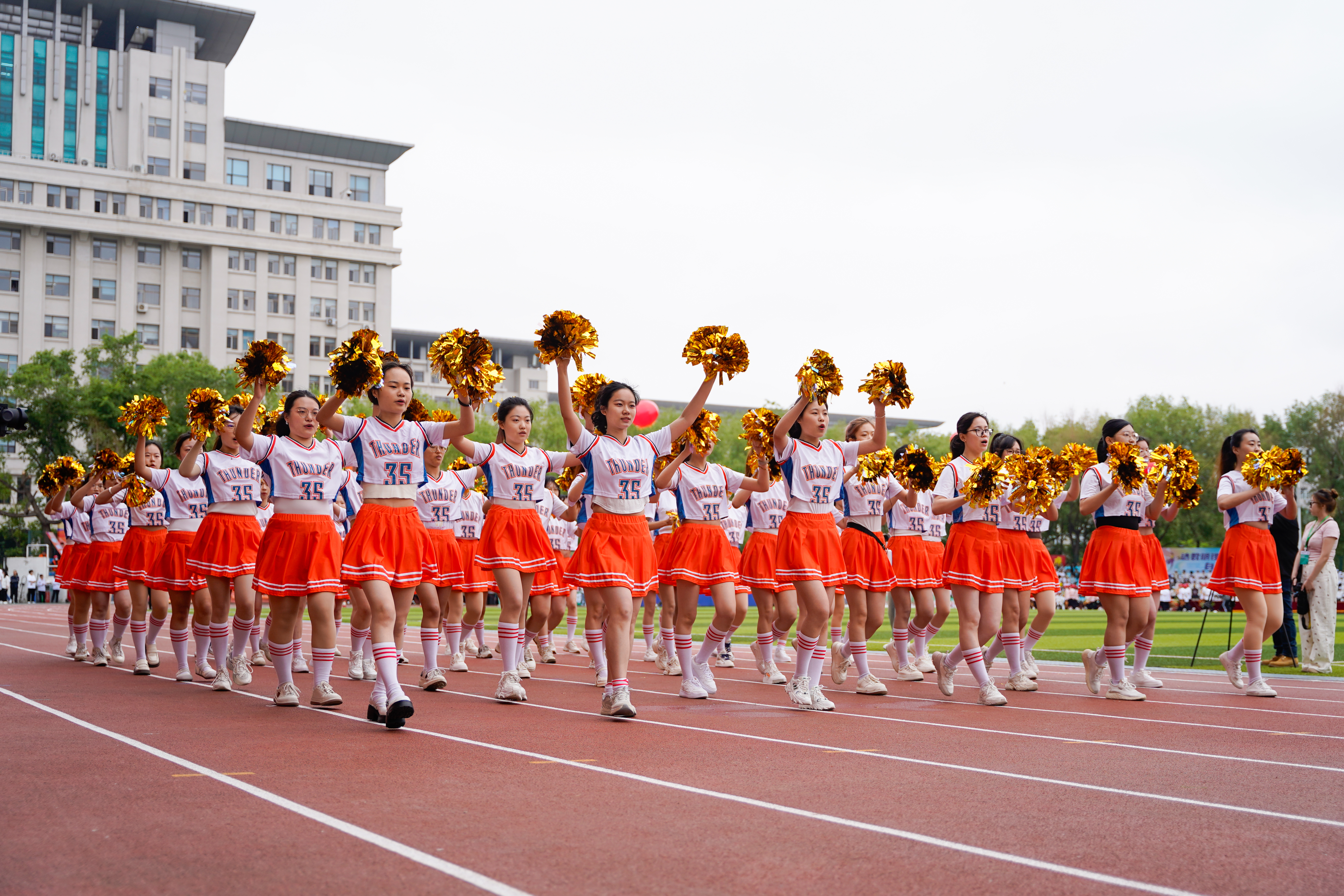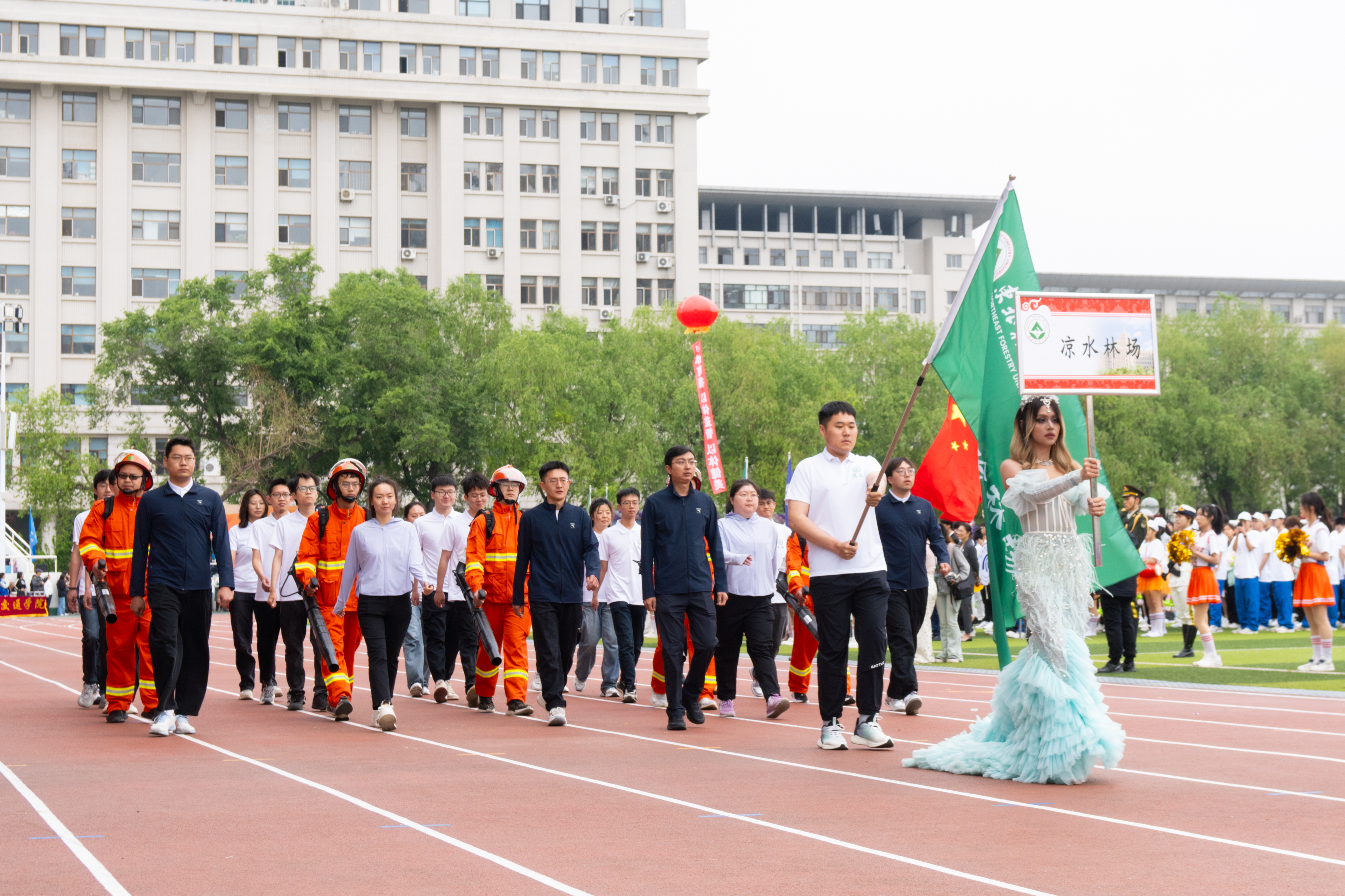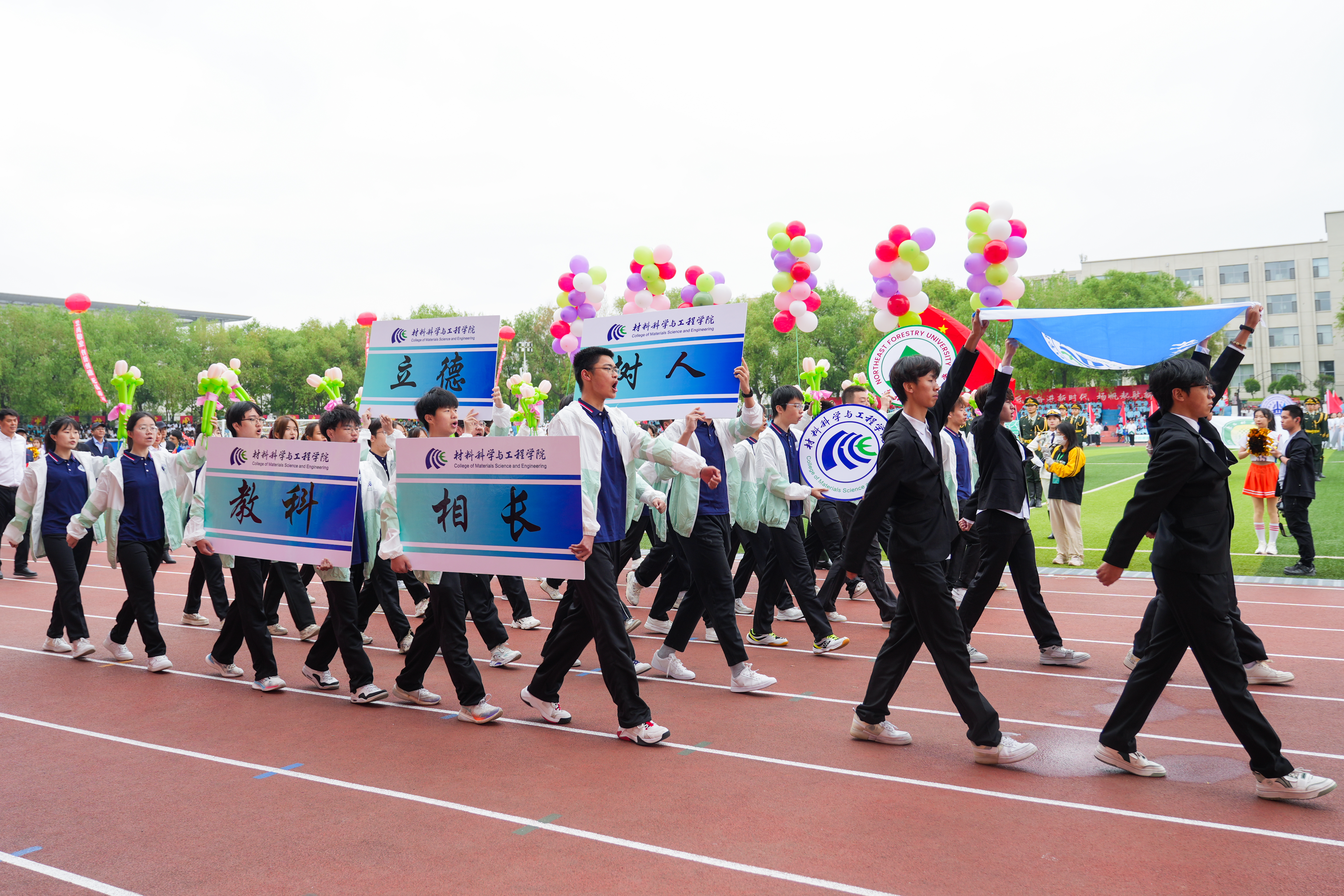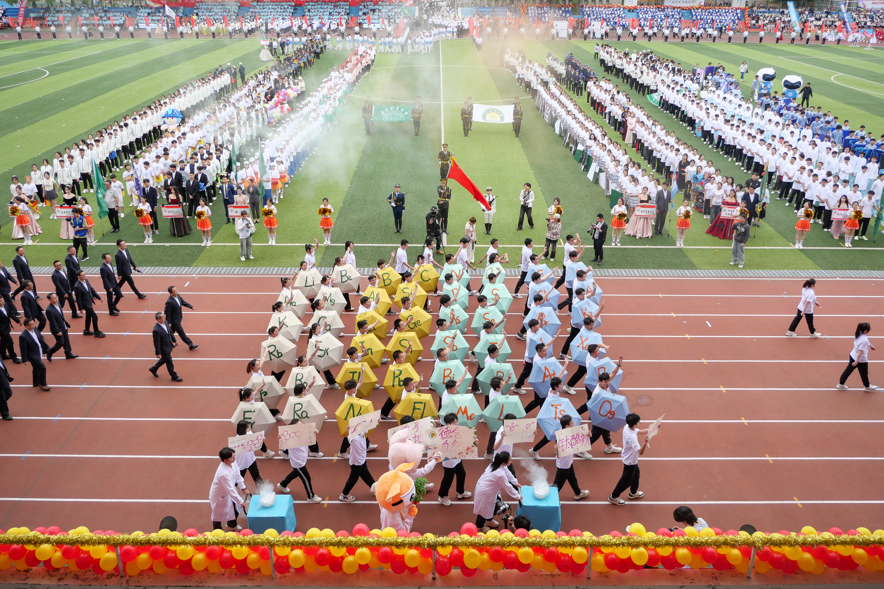 标有学校建校年份“1952”的展板、花式腰鼓、气球鲜花装束、彩色缎带、卡通人偶、东林奋进红和森林绿的扇子、写有化学元素名称的彩伞、伴有手风琴的交际舞……各支代表队极具学院特色和东林特色的出场形式,展现出新时代东林人守正创新、踔厉奋发的良好精神风貌,赢得了现场观众阵阵掌声。