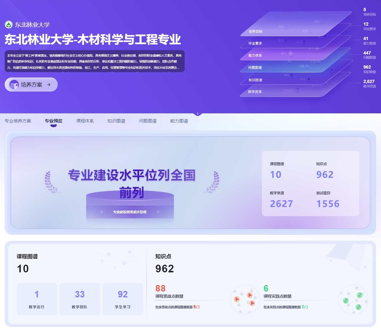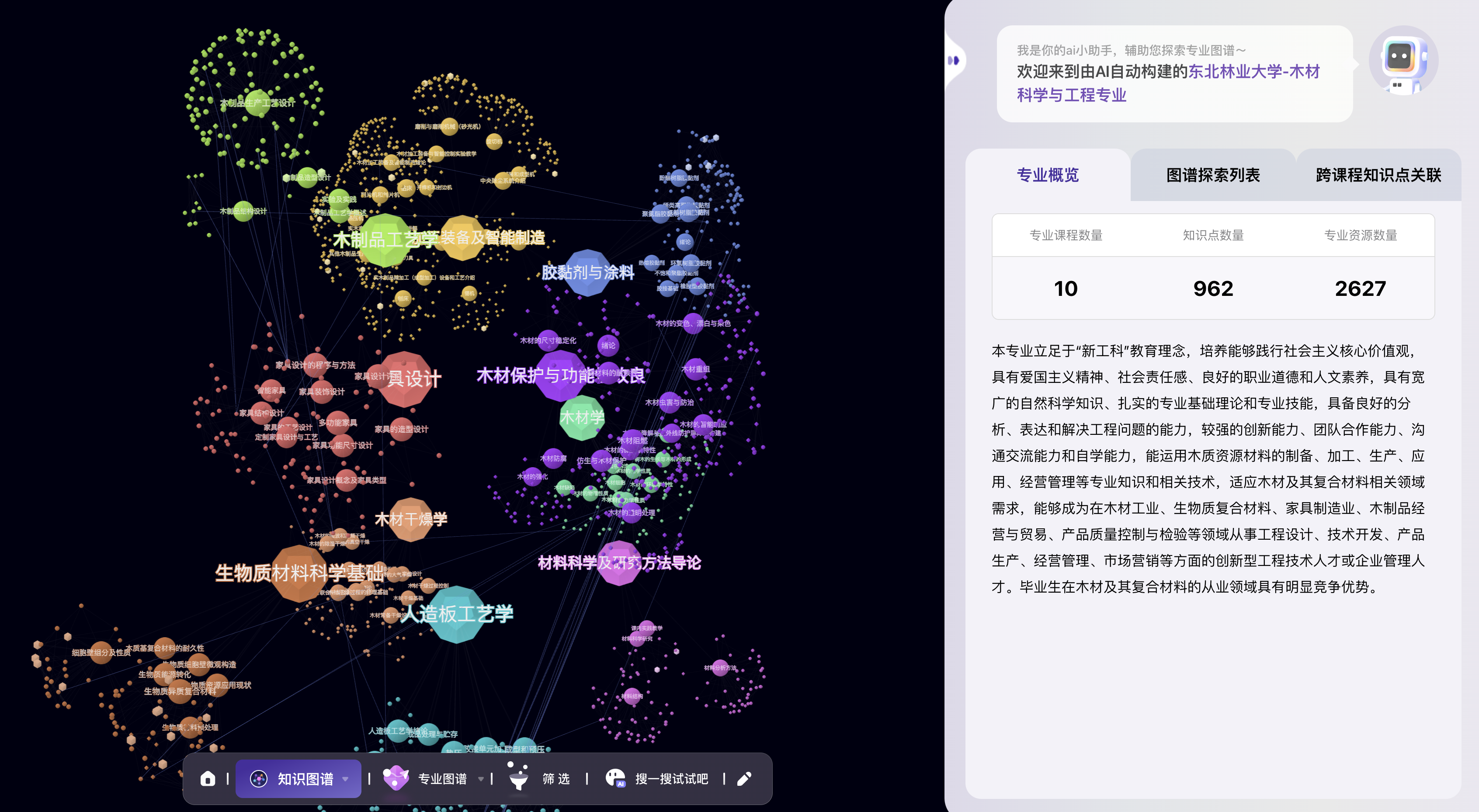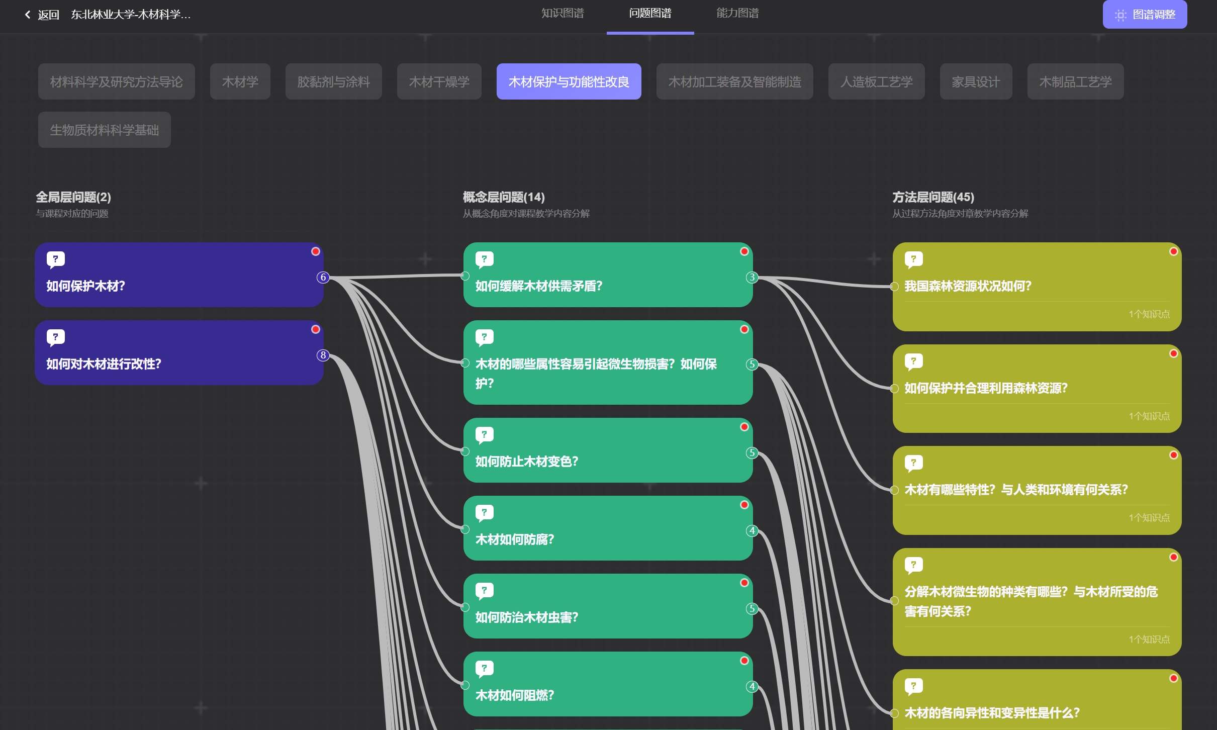 专业知识图谱从木材科学与工程专业基础理论知识、基本科学问题、产业发展需求出发,紧扣培养专业、培养方案和人才培养目标,建立服务国家战略、助力教育高质量发展的知识图谱。涵盖木材学、木材干燥学、木制品工艺学、木材保护与功能性改良等多门专业核心课程,将人工智能服务贯穿在课前、课中、课后学习全过程,打破传统教学时间、空间的限制,对专业虚拟教研室的搭建起到助推作用,实现教学、教研资源的共建共享。