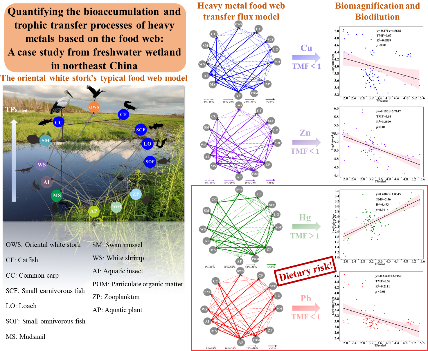研究团队以三江平原湿地旗舰种、伞护种——东方白鹳为例,利用稳定同位素技术,基于更精确的尺度营养级框架,结合MixSIAR模型,在构建东方白鹳定量食物网的基础上,创新性地提出利用物种间摄食比率核算重金属传输通量的新方法,从多节点、多链路、跨营养级互作的视角揭示了东方白鹳典型食物网络中重金属的转移路径与通量。
