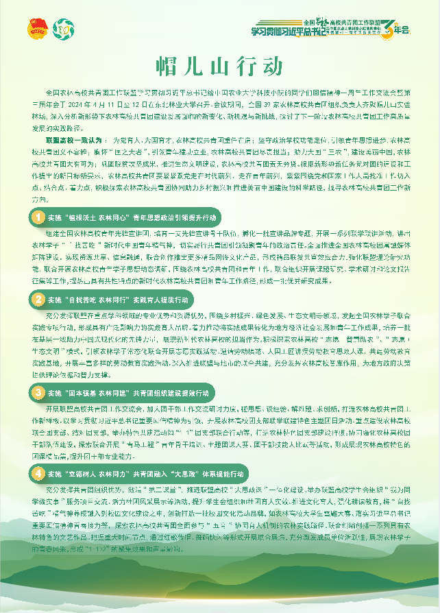 期间,会议发布了《全国农林高校共青团工作联盟“帽儿山行动”方案》,提出未来即将协同实施“四大专项行动”,即“植根沃土 农林同心”青年思想政治引领提升行动、“自找苦吃 农林同行”实践育人提质行动、“固本强基 农林同建”共青团组织建设提效行动、“立德树人 农林同力”共青团融入“大思政”体系提能行动。
