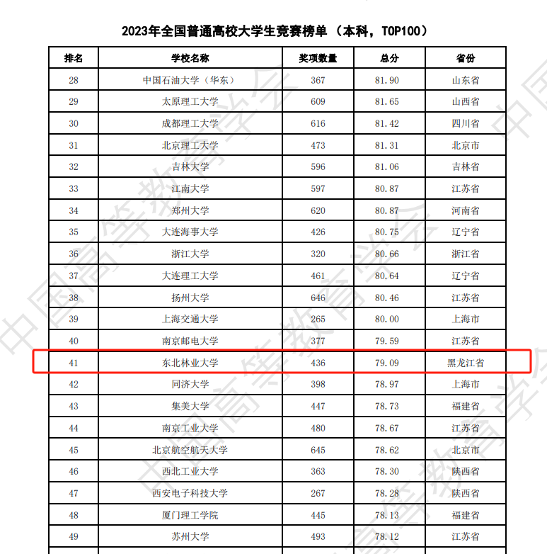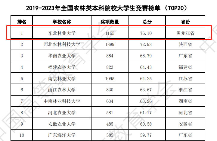 3月22日,中国高等教育学会高校竞赛评估与管理体系研究专家工作组发布《2023全国普通高校大学生竞赛分析报告》。我校在《2019~2023年全国农林类本科院校大学生竞赛榜单(TOP20)》中,以总分76.1(获奖1165项)的成绩再次位居第一,连续六年蝉联榜首。我校在《2023年全国普通高校大学生竞赛榜单(本科,TOP100)》中位居41位。在《2019~2023年全国“双一流”建设高校大学生竞赛榜单》中位居42位。