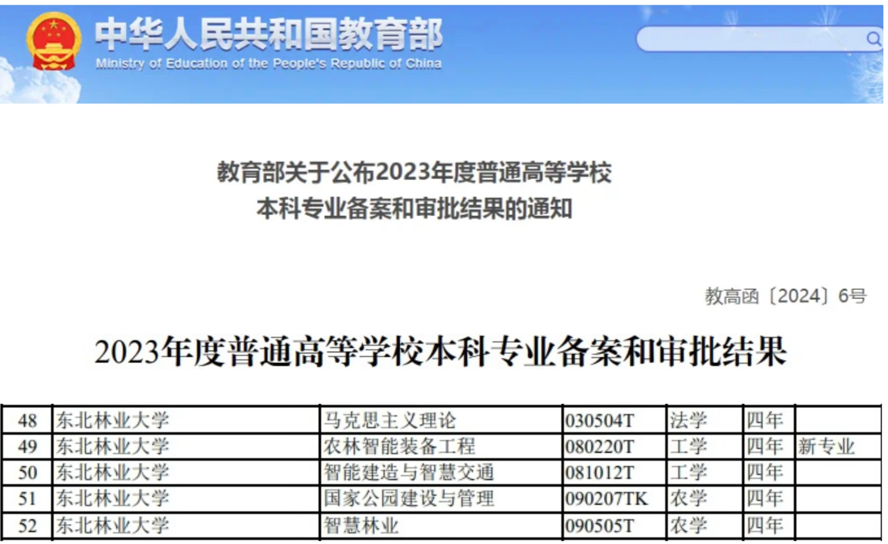 日前,教育部公布了2023年度普通高等学校本科专业备案和审批结果,我校马克思主义理论、农林智能装备工程、智能建造与智慧交通、国家公园建设与管理、智慧林业5个专业获批增设。其中农林智能装备工程为“目录外新增审批本科专业”,为全国首次设置。