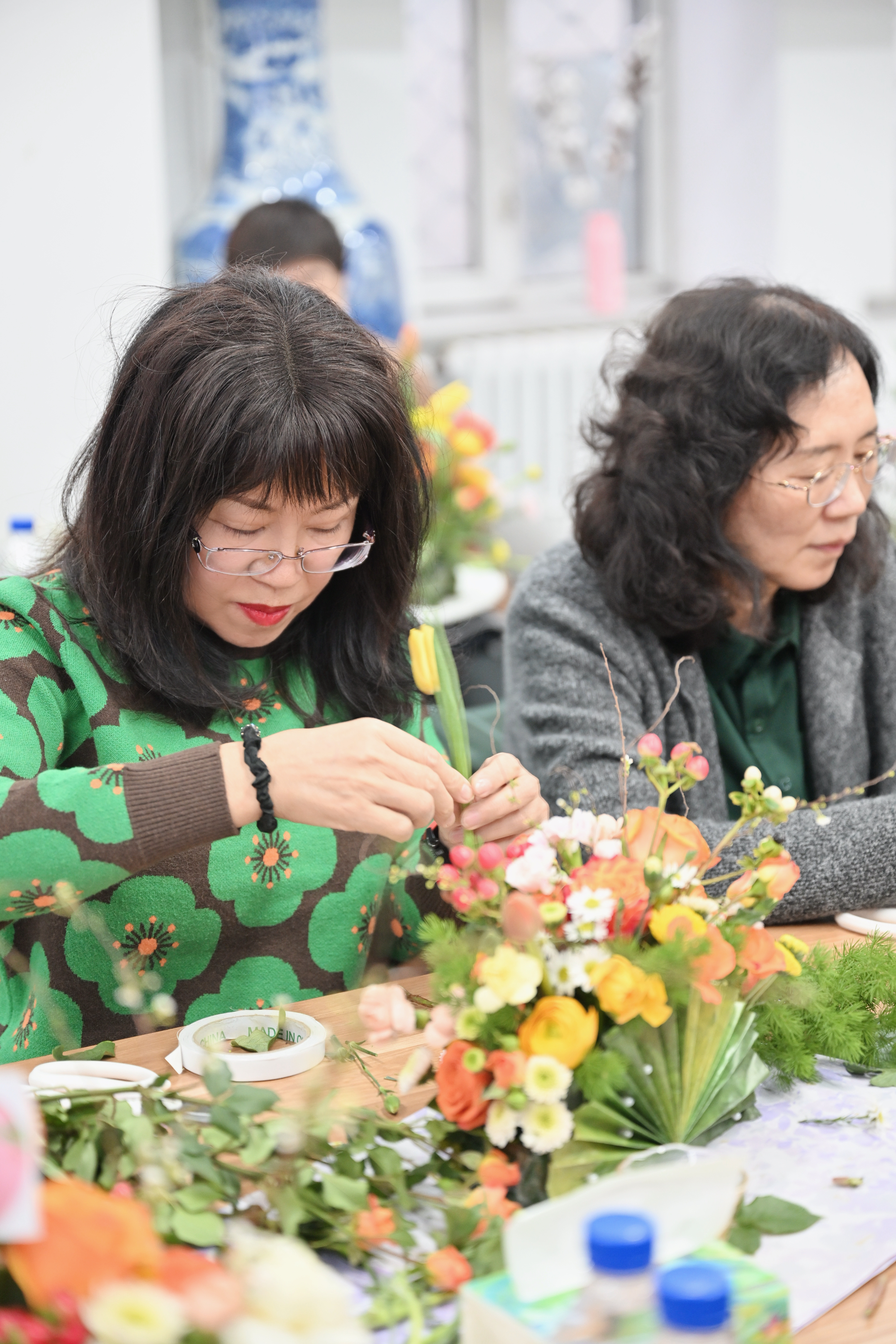 活动仪式感满满,大家以花会友,一句句关于花的诗词,脱口而出,为插花课堂增添了古典的韵味。苏小霞老师对鲜花常识、色彩搭配、插花技巧等作详细讲解和示范后,大家动手实践,在花草世界里,精心构思、大胆创意,一朵朵娇艳的玫瑰、高雅的水仙、清雅的康乃馨绽放在花束上,再以小雏菊、绿叶精心点缀……随后,一簇簇美丽别致、层次丰富,并且独一无二、灿烂灵动的插花作品“新鲜出炉”。大家互相交流心得、拍照留念,对自己的作品爱不释手,一张张与花一样的笑脸,洋溢着满满的成就感和幸福感。课后,女职工们还分享着插花活动的体验,表示将会把插花的乐趣转化为点缀工作生活之美,释放压力、激发活力。