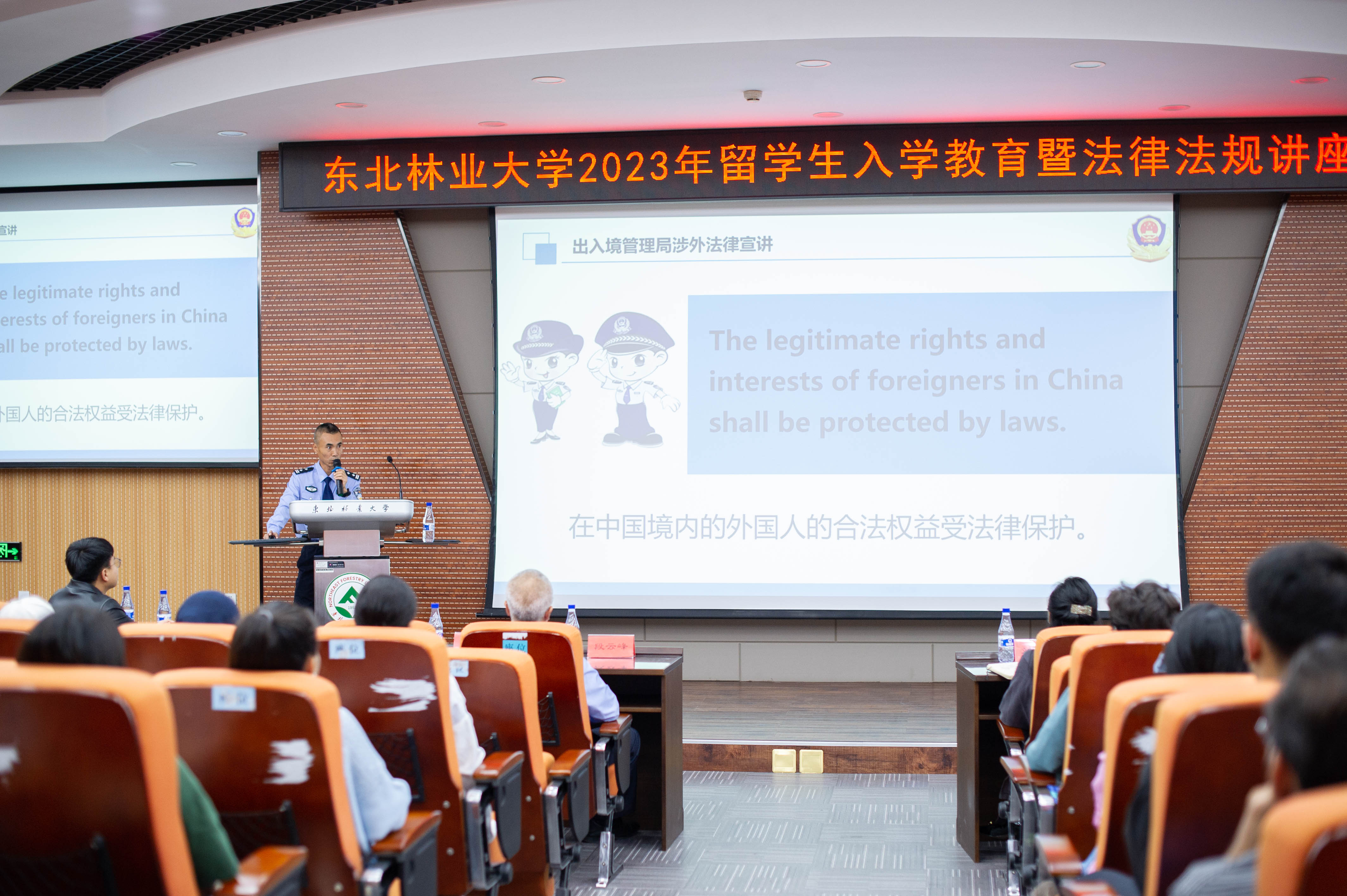 9月21日下午,哈尔滨市公安局出入境管理局外国人管理科科长段云峰、一级警长金云龙入校做法律法规宣讲。金云龙用中英双语为同学们详细解读了《外国人出入境管理条例》,明确了外国人在中国境内的合法权益受到保护,同时要求全体留学生在中国境内期间遵守中国法律法规,不得危害中国国家安全、破坏社会公共秩序,严禁非法入境、非法居留、非法就业。