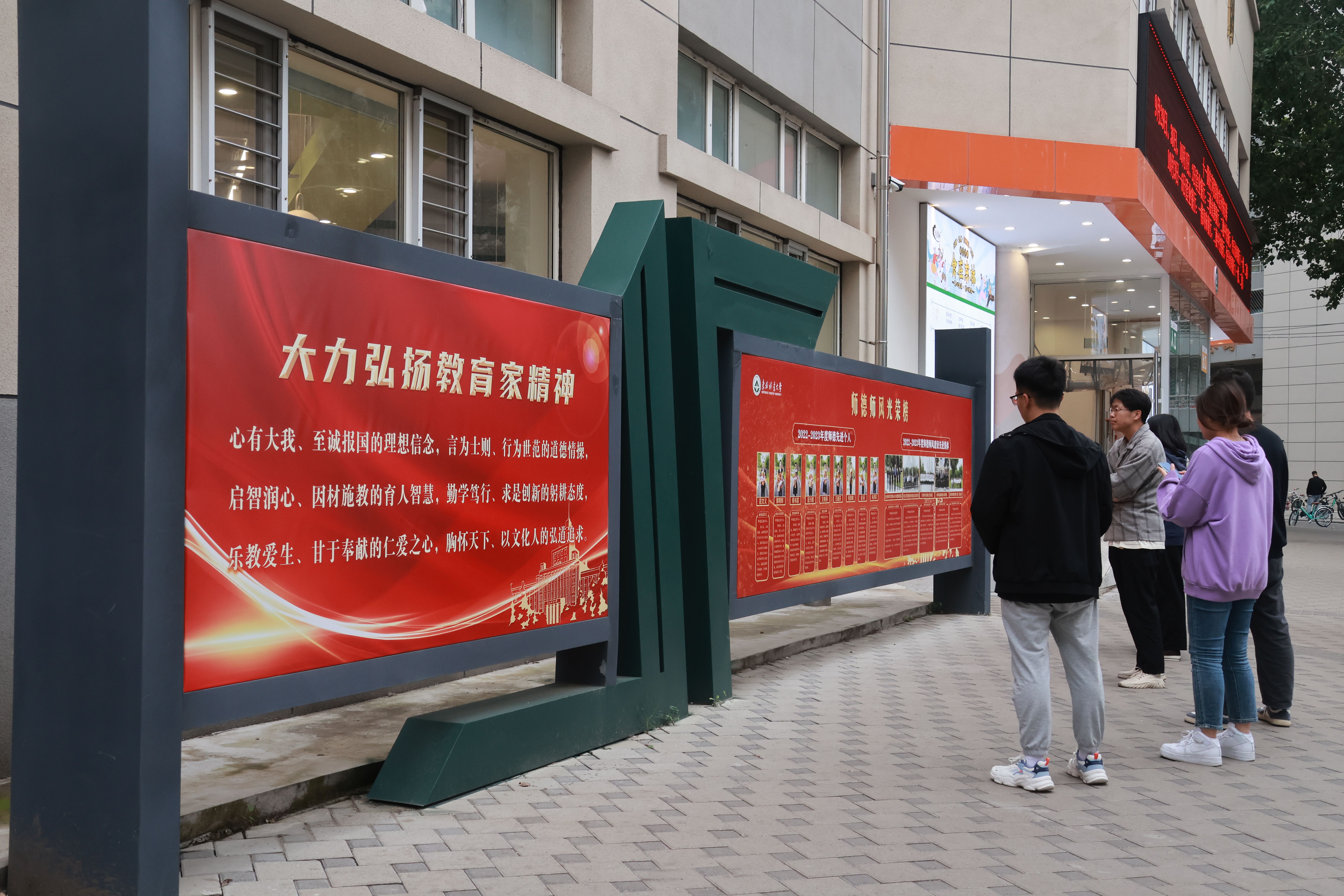 “心有大我、至诚报国的理想信念”“言为士则、行为世范的道德情操”……这几天,校园主干道路两侧,以教育家精神六个方面的核心要义为内容的条幅、展板、海报,分布于学校食堂、楼廊、广场、办公室、会议室等各处,吸引路过的师生纷纷驻足观看,热烈讨论。与此同时,学校全媒体推出师德师风先进集体的采访报道,引导广大教师修身治学、树木树人,做学生为学、为事、为人的大先生,不忘立德树人初心,牢记为党育人、为国育才使命,为培养德智体美劳全面发展的社会主义建设者和接班人作出新的更大贡献。