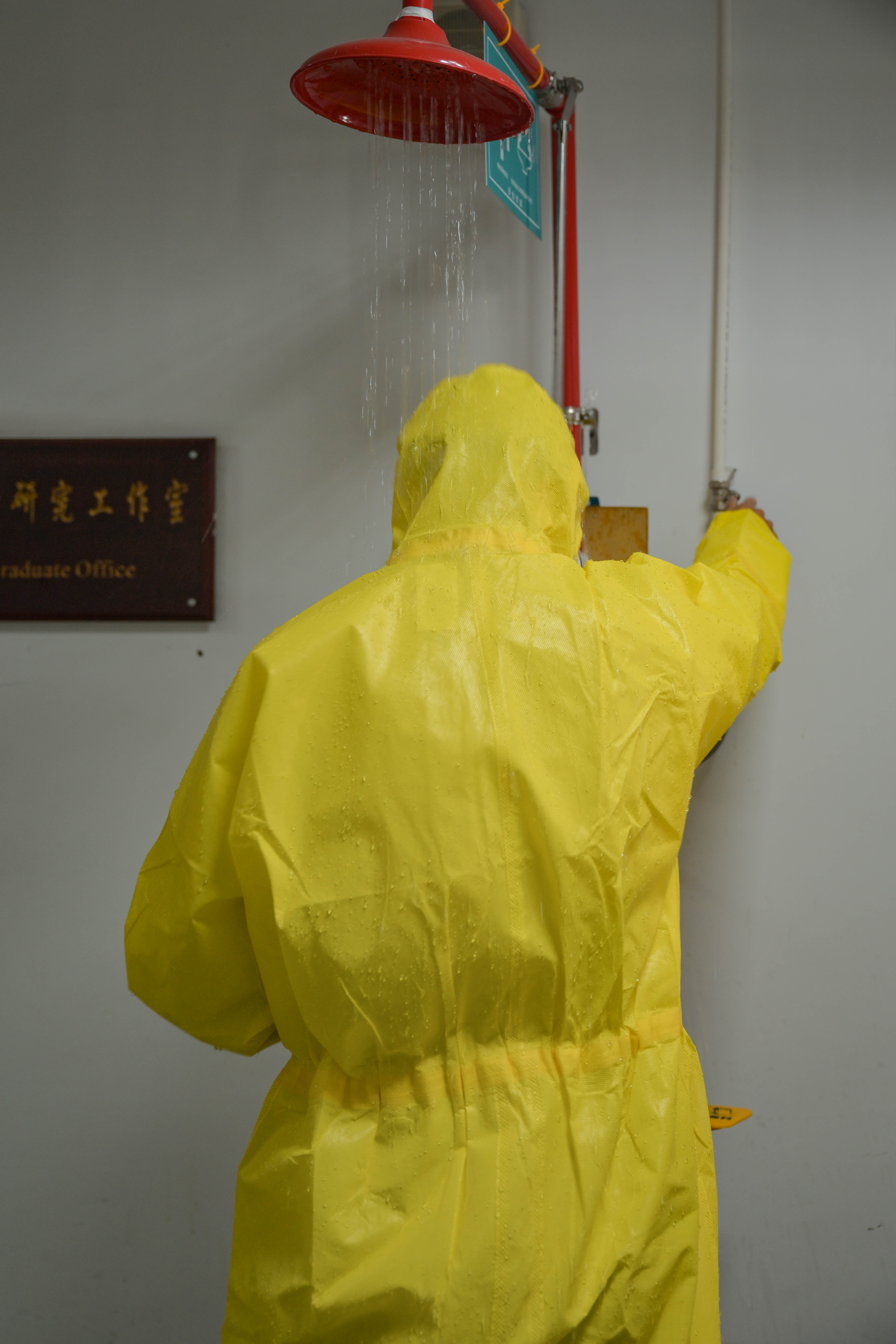 实验室碱性液体和酸性液体对人的伤害性都比较大,现场同学还实践学习了喷淋器和洗眼器的使用方法。