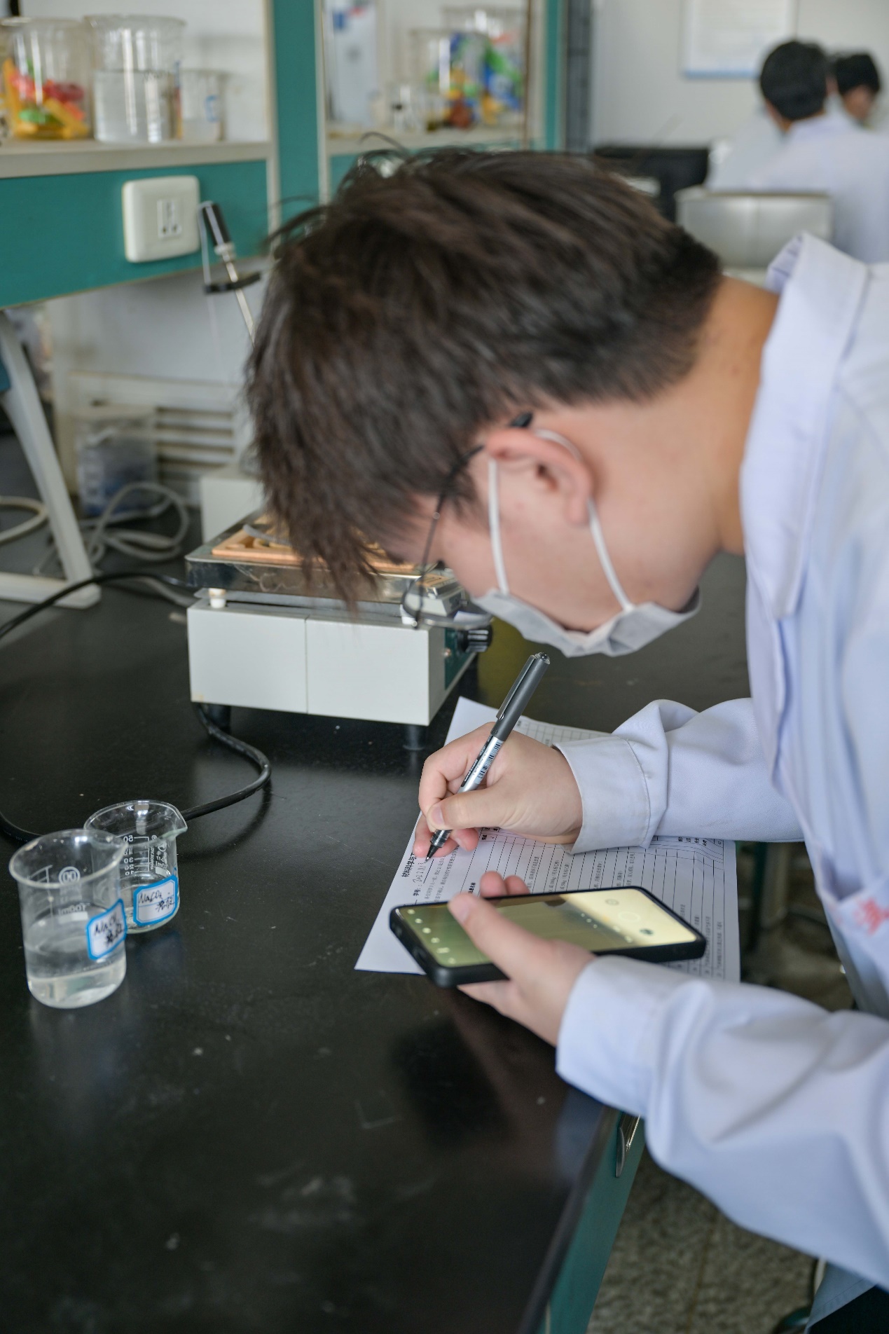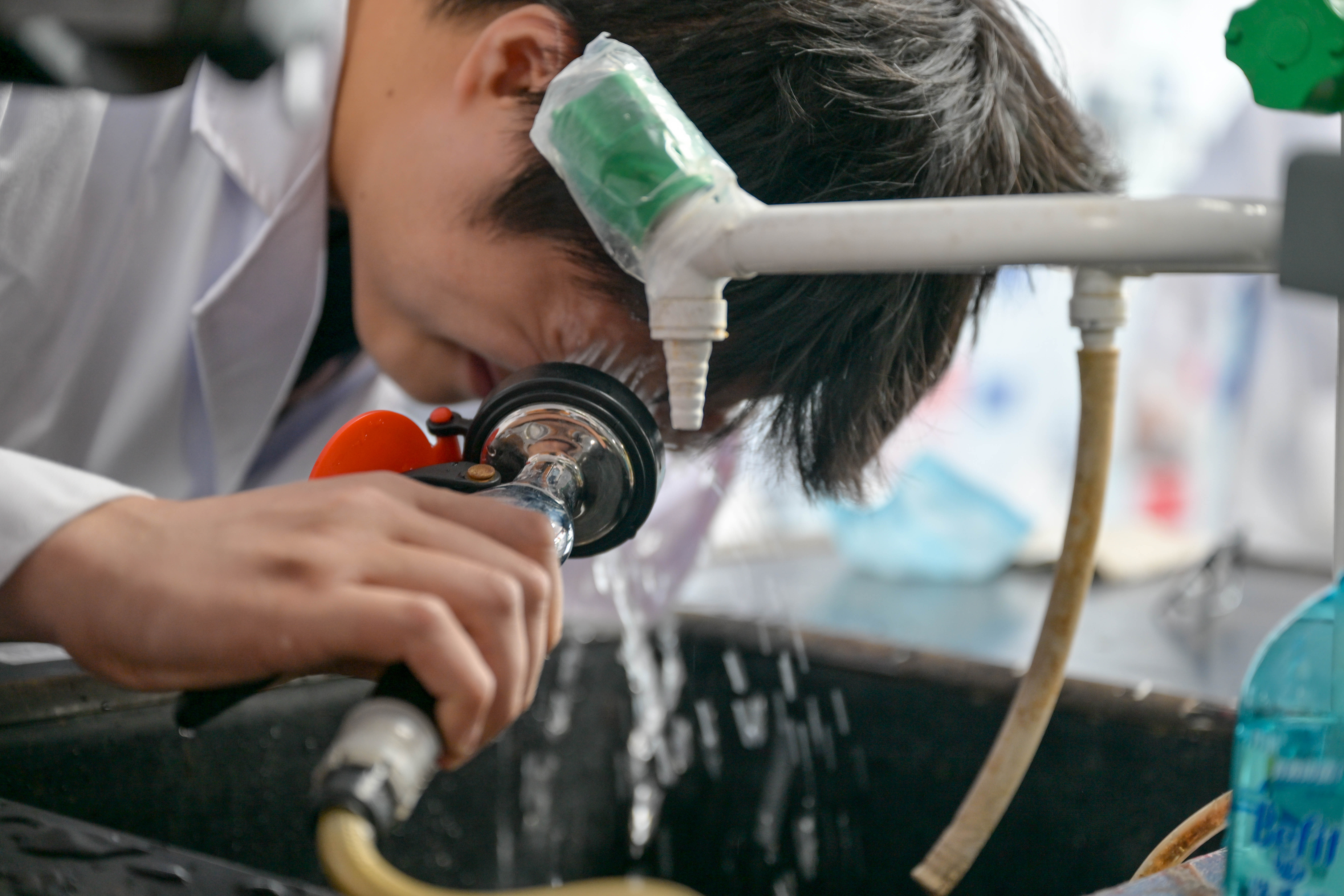 “快点,我的胳膊被灼伤了!”实验室另一边,一位同学在实验过程中,不慎将碱性液体滴洒到了皮肤上,旁边的同学赶紧拿来纱布上前帮忙擦拭。随后,被灼伤的同学用清水冲洗,同时还用PH试纸不断测定创面的酸碱度……