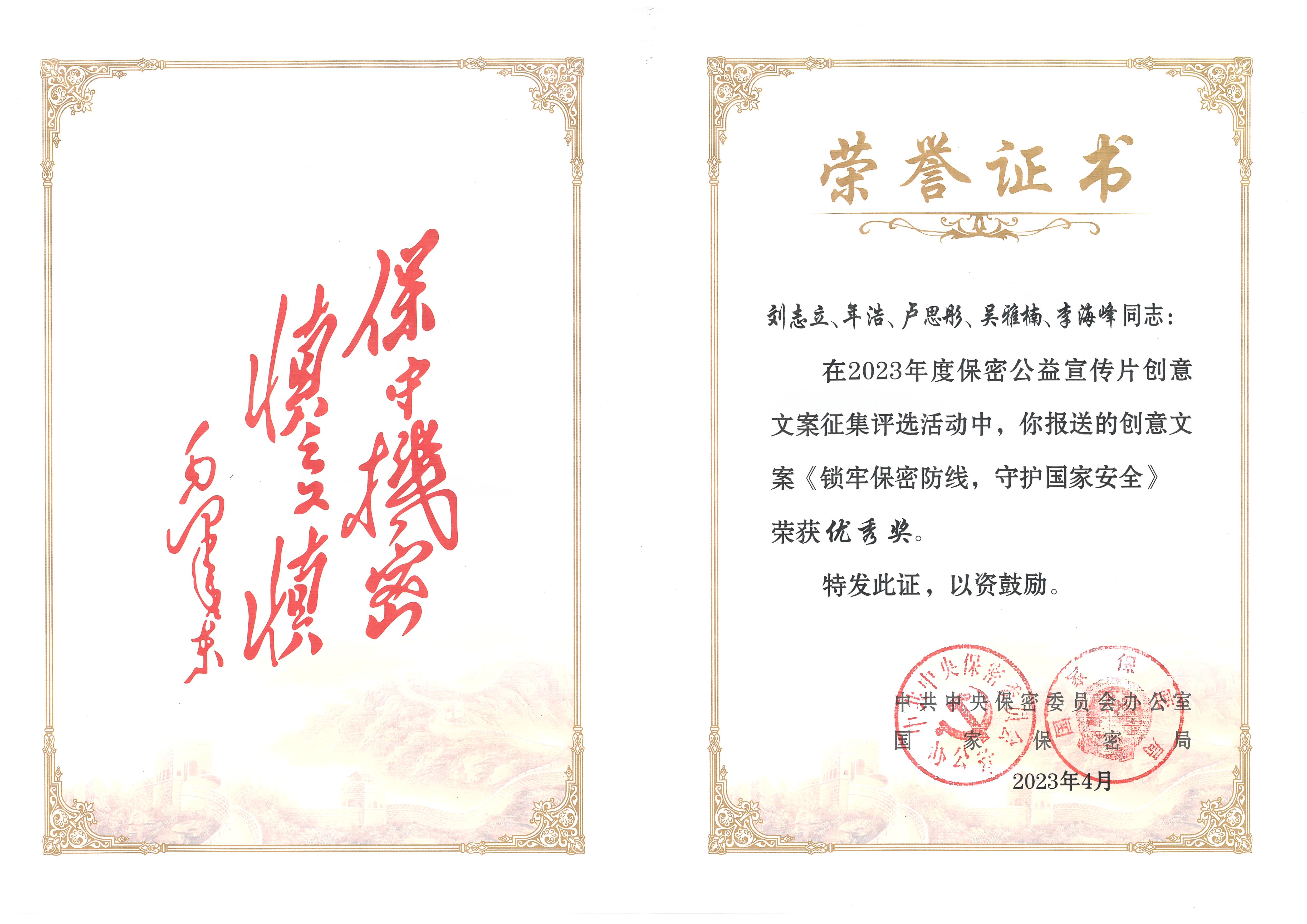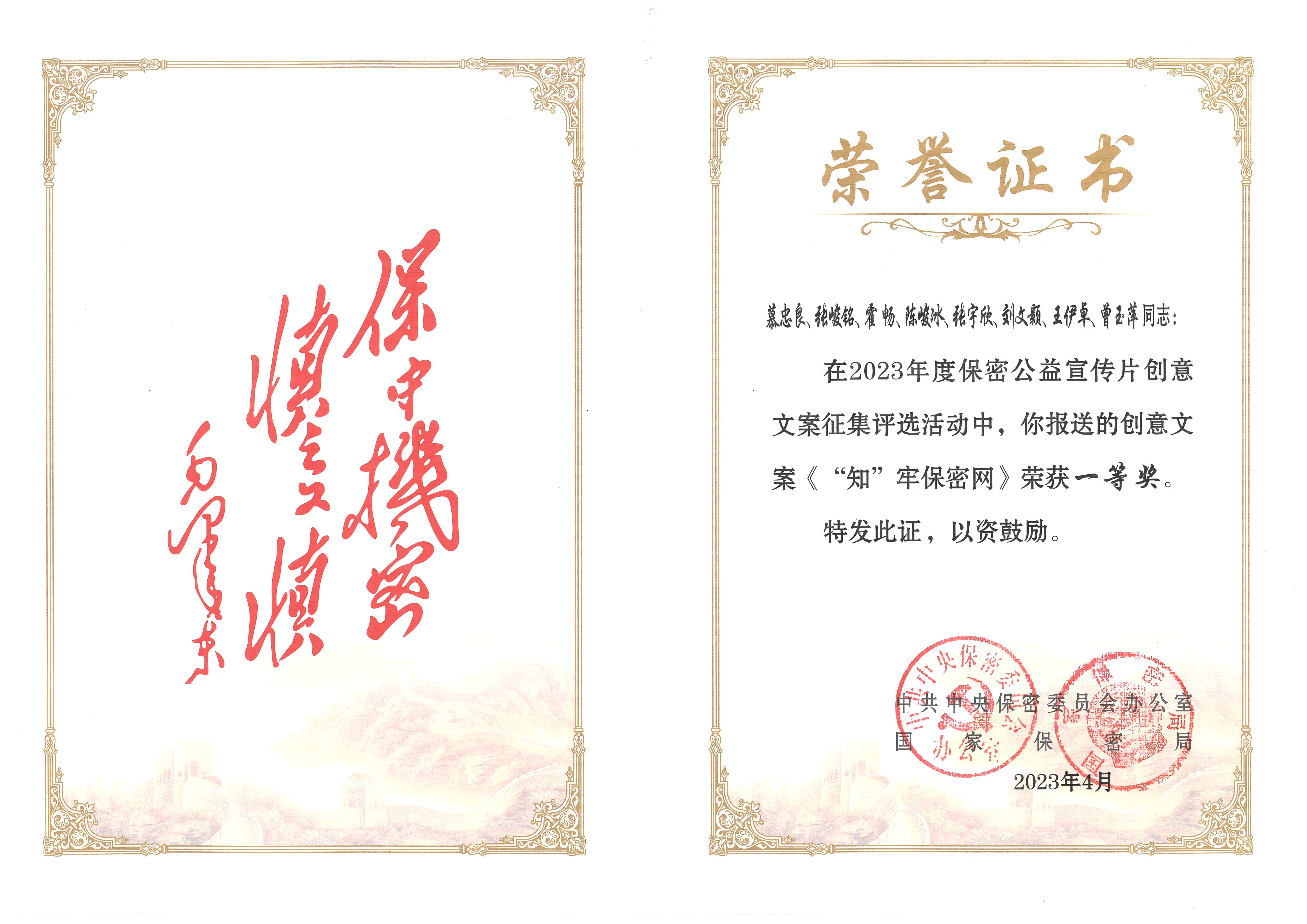此前,我校文案作品《藏在照片里的秘密》获得全国一等奖,并被中央保密办(国家保密局)录用为保密主题宣传创意文案,用于2023年“4·15”全民国家安全教育日保密主题宣传片制作,并面向全国推广。