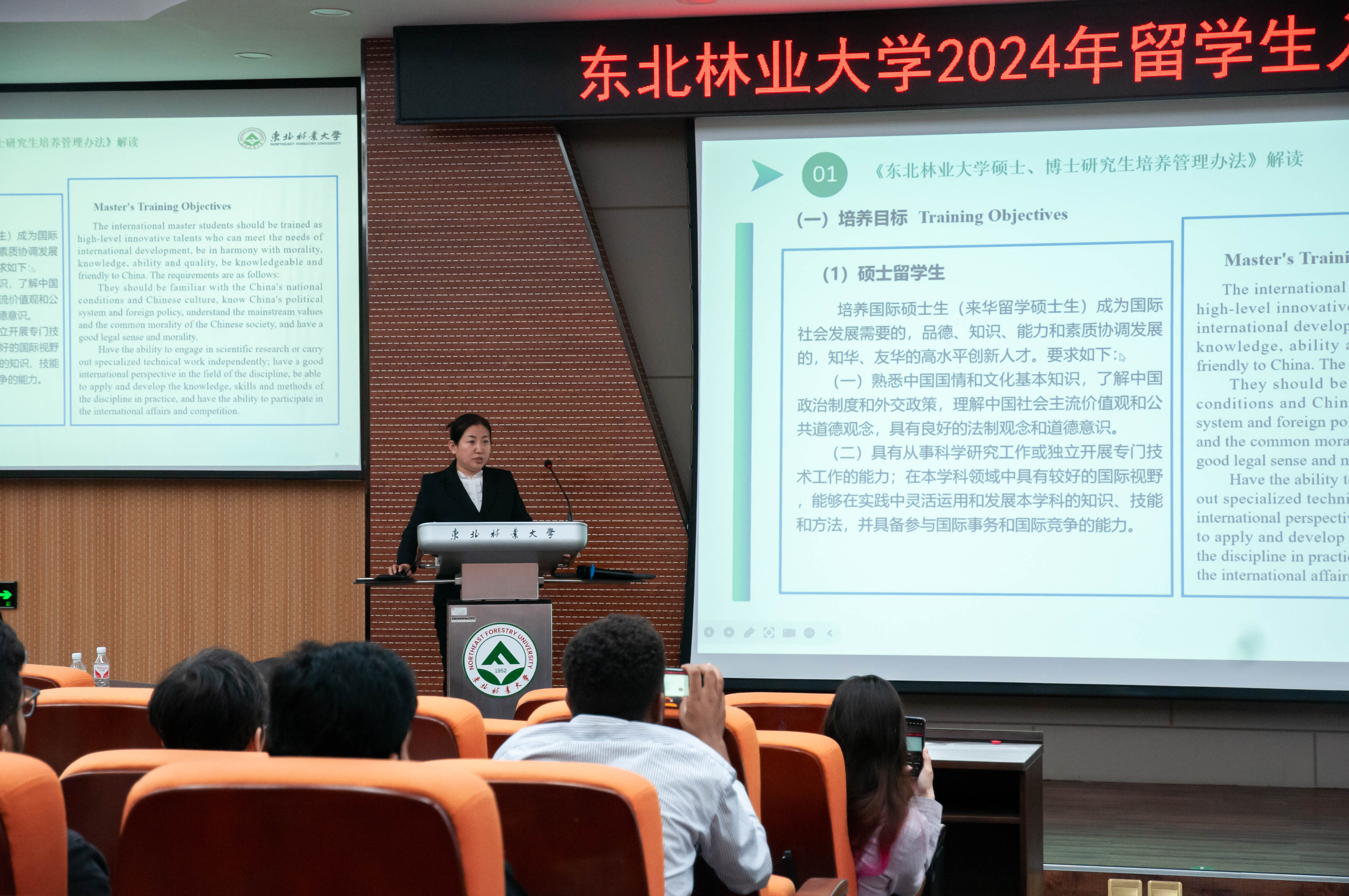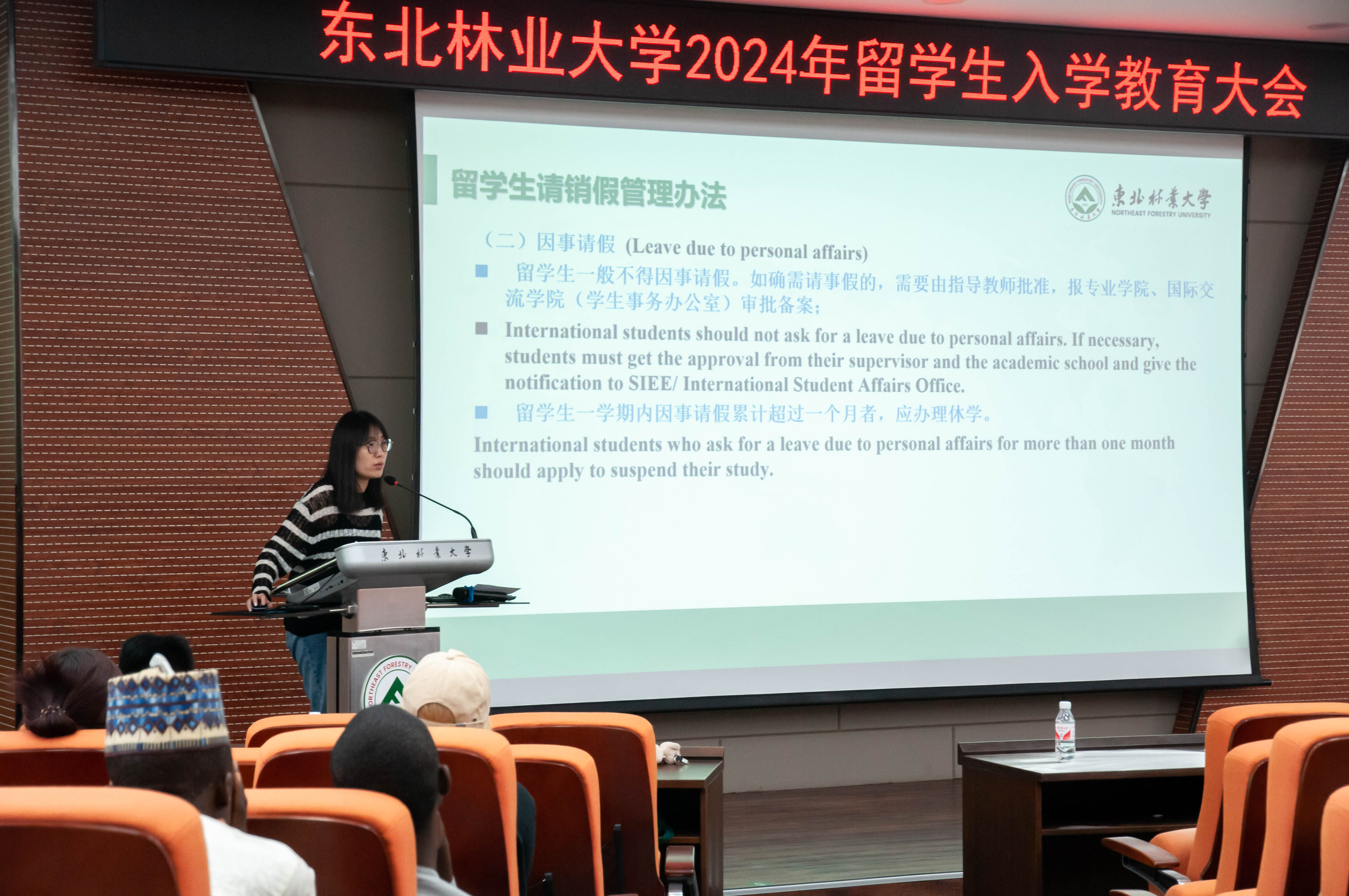 入学教育活动中,哈尔滨市公安局出入境管理局外国人管理科一级警长金云龙为留学生新生作中国法律法规宣讲。金云龙用英文为同学们详细解读了《中华人民共和国外国人出入境管理条例》,强调了留学生在中国境内期间须遵守中国法律法规,不得危害中国国家安全、破坏社会公共秩序,严禁非法入境、非法居留、非法就业,帮助留学生树立法治思维,提升法律意识。