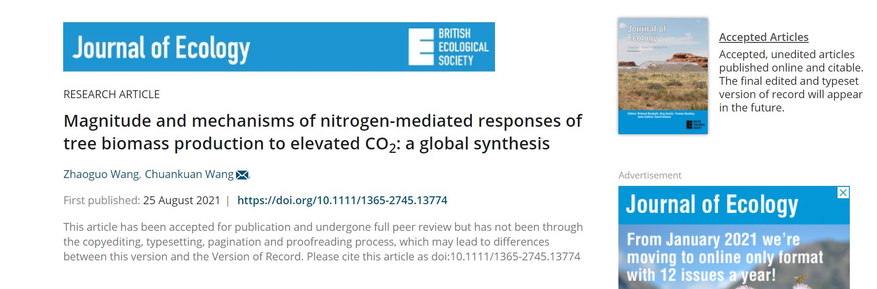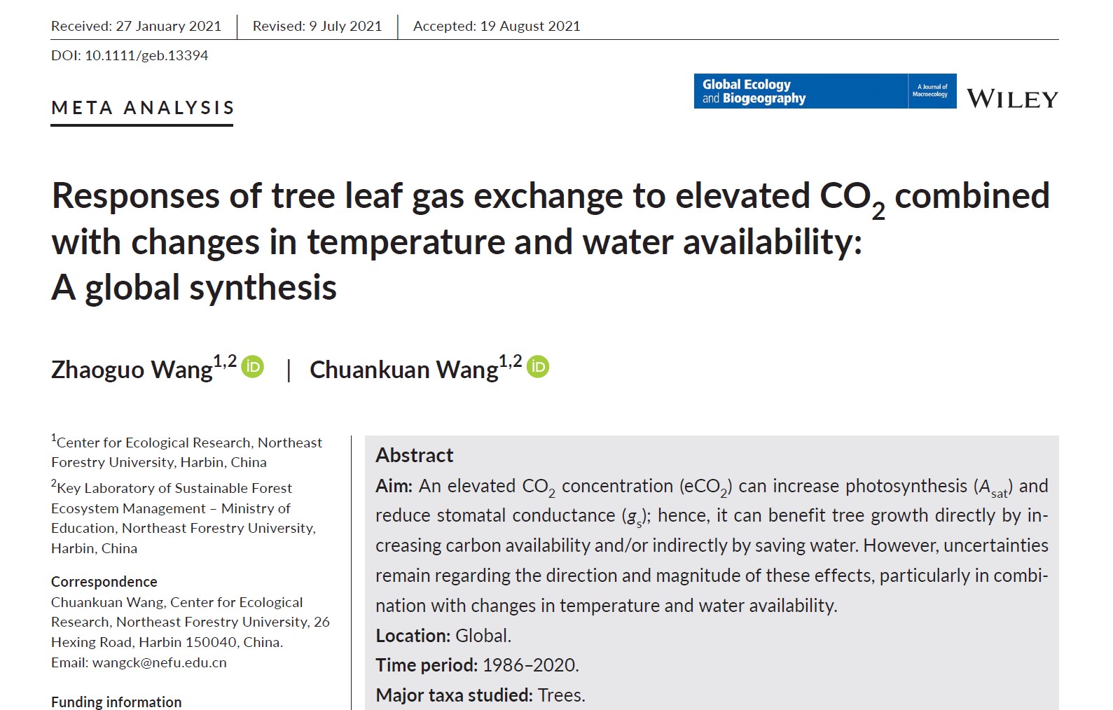 近日,我校生态研究中心王传宽教授带领博士研究生王兆国在森林碳循环与全球变化领域的研究取得新进展,成果以题为《树木叶片气体交换对CO2浓度升高及与温度和水分变化的联合响应》(Responses of tree leaf gas exchange to elevated CO2combined with changes in temperature and water availability: a global synthesis)和《树木生物量生产对CO2浓度升高的氮介导响应强度及机制》(Magnitude and mechanisms of nitrogen-mediated responses of tree biomass production to elevated CO2: a global synthesis)分别发表在生态学国际著名期刊《Global Ecology and Biogeography》和《Journal of Ecology》上。