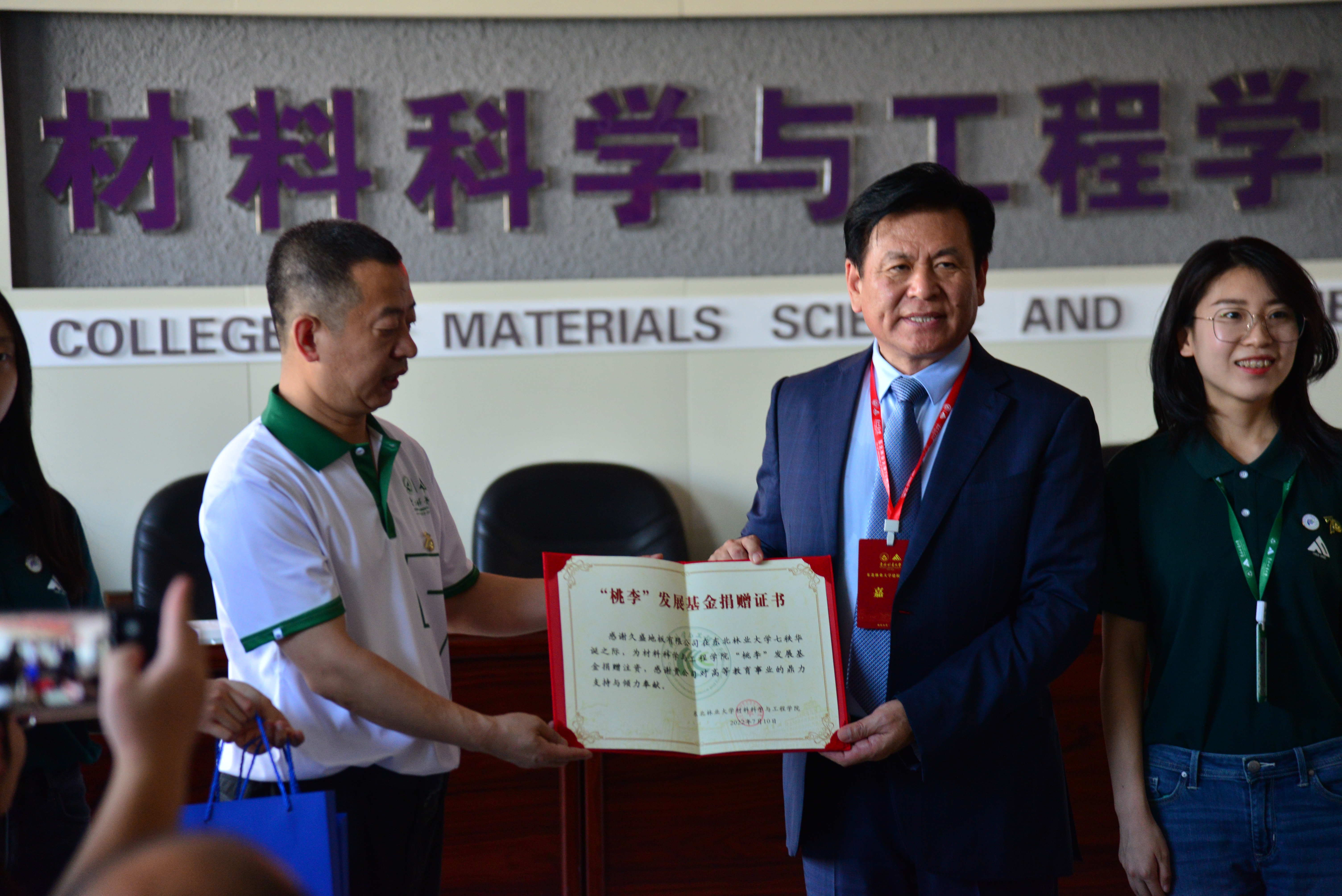 随后,张恩玖主席向“桃李”发展基金项目捐资。材料科学与工程学院党委书记孟新为久盛地板有限公司颁发捐赠证书和校庆纪念品。