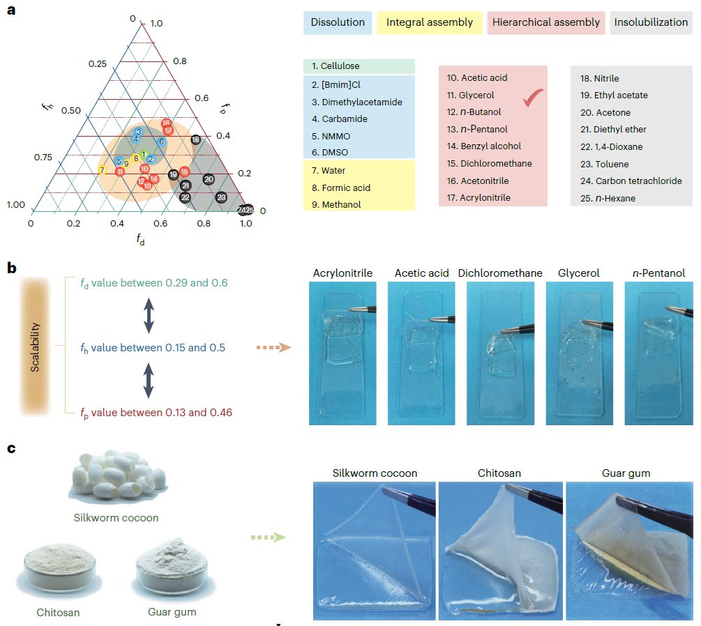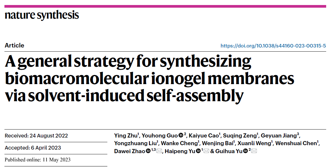 近日,我校生物质材料科学与技术教育部重点实验室于海鹏教授科研团队提出一种溶剂诱导组装及快速制备生物大分子离子凝胶膜的通用新策略,成果以“A general strategy for synthesizing biomacromolecular ionogel membranes via solvent-induced self-assembly”为题,发表于《Nature Synthesis》期刊。