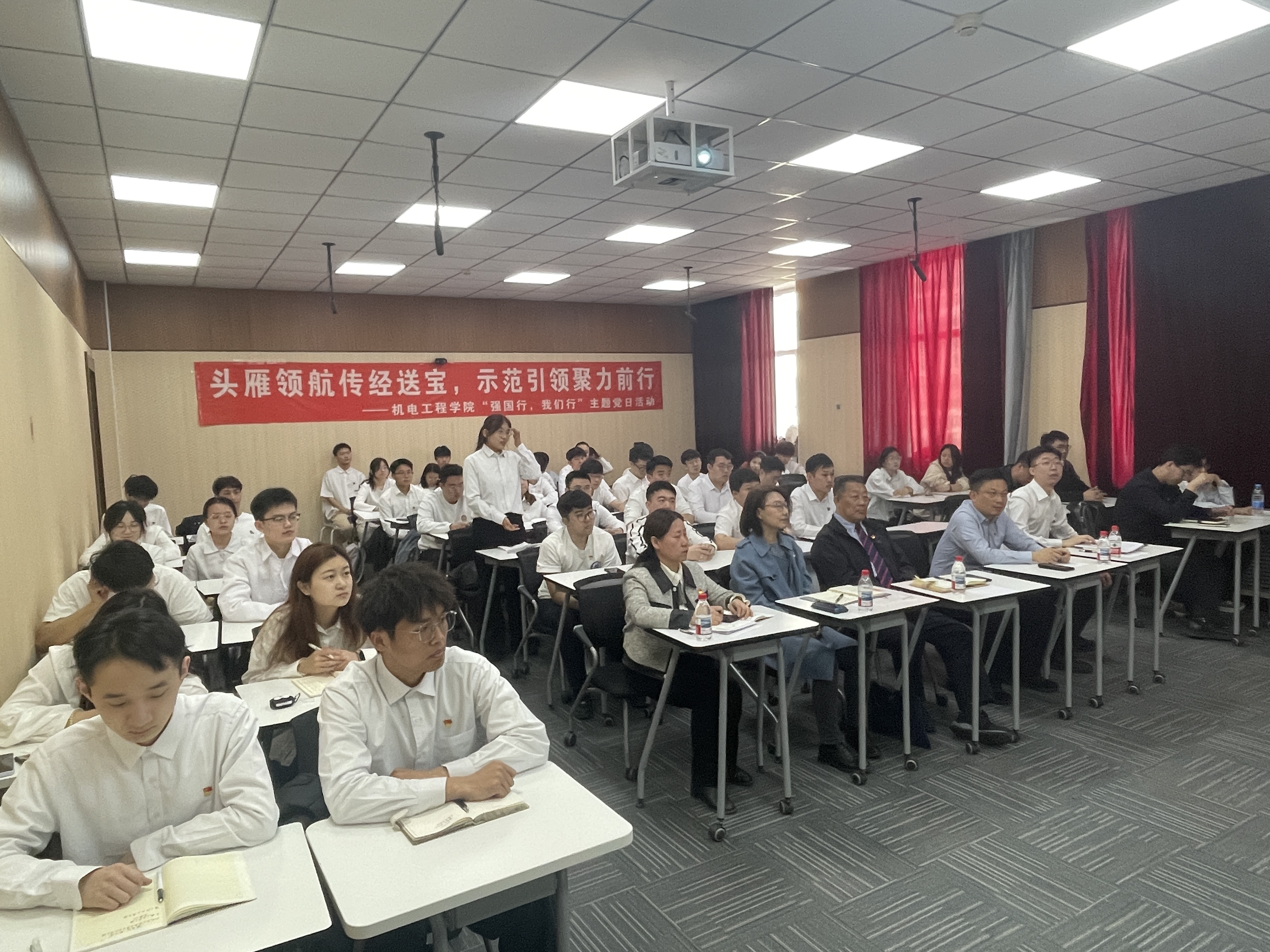为高质量推进“强国行”专项行动,扎实开展深入贯彻中央八项规定精神学习教育,以优良党风促进优良学风,全力迎接即将开始的本科教育教学审核评估,4月29日上午9时,机电工程学院在奥林楼智慧教室举办了“强国行,我们行”主题党日。“双带头人”教师党支部书记“强国行”专项行动团队、机械设计制造及其自动化党支部,黑龙江省高校党建工作样板党支部、晨曦公益党支部,黑龙江省首批研究生样板党支部、博士研究生党支部师生代表共计60余人参加活动。活动由学院党委书记王佳彤主持。教育部党建联络员王延、学校党委组织部副部长李想受邀参加。