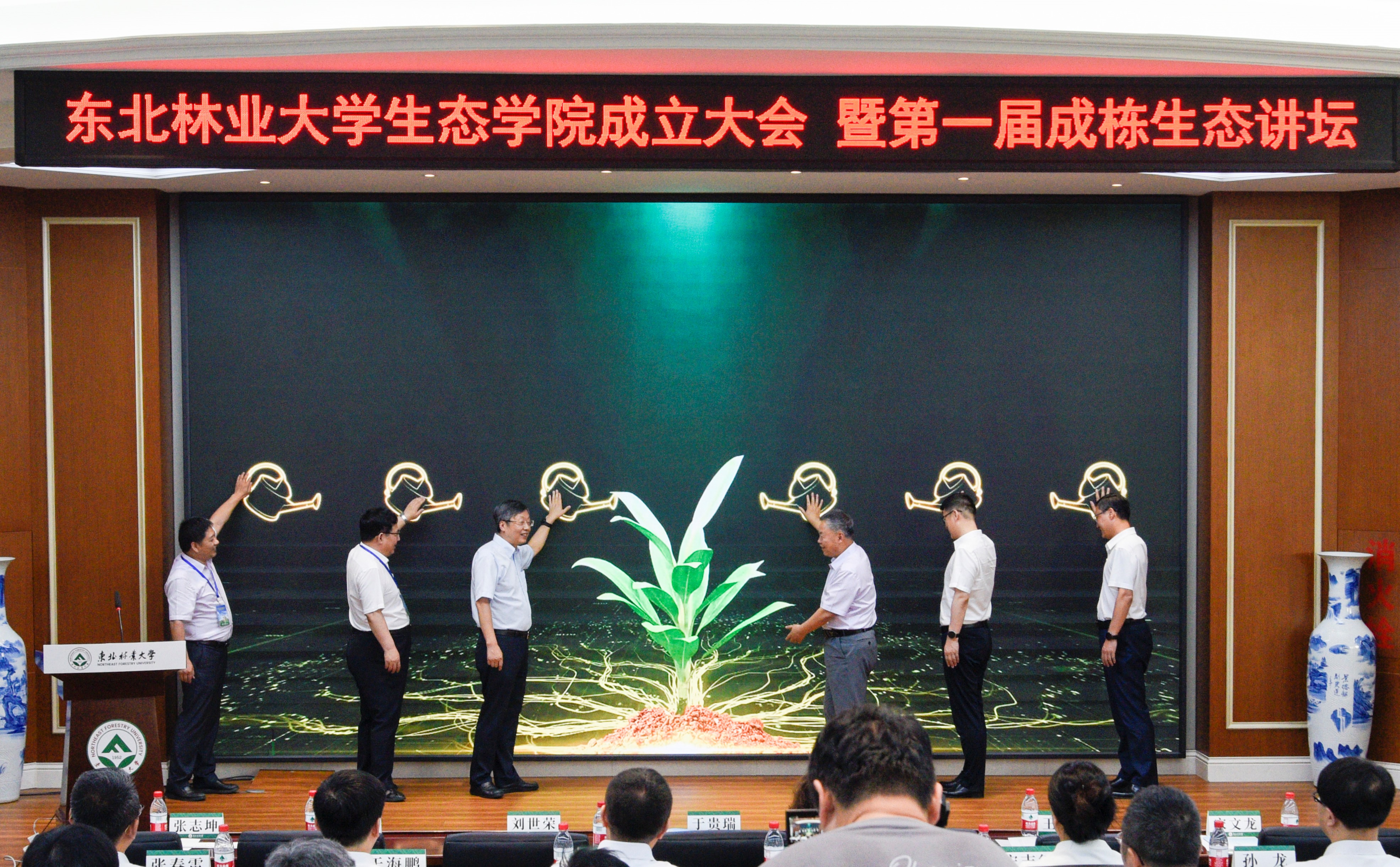 中国科学院院士于贵瑞,中国工程院院士刘世荣,龙江森工集团总经理王齐丰,党委书记张志坤,校长宋文龙、生态学院院长周旭辉共同为生态学院揭牌。
